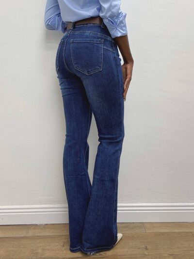Jeans a vita alta dal taglio flare, che slancia la figura e dona un tocco rétro e sofisticato. Realizzati in denim resistente ma confortevole, questi jeans presentano una chiusura frontale con zip e bottoni, che garantisce una vestibilità sicura e aderente. I passanti per cintura permettono di personalizzare il look con cinture di ogni tipo, mentre le quattro tasche funzionali aggiungono praticità e stile.