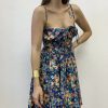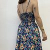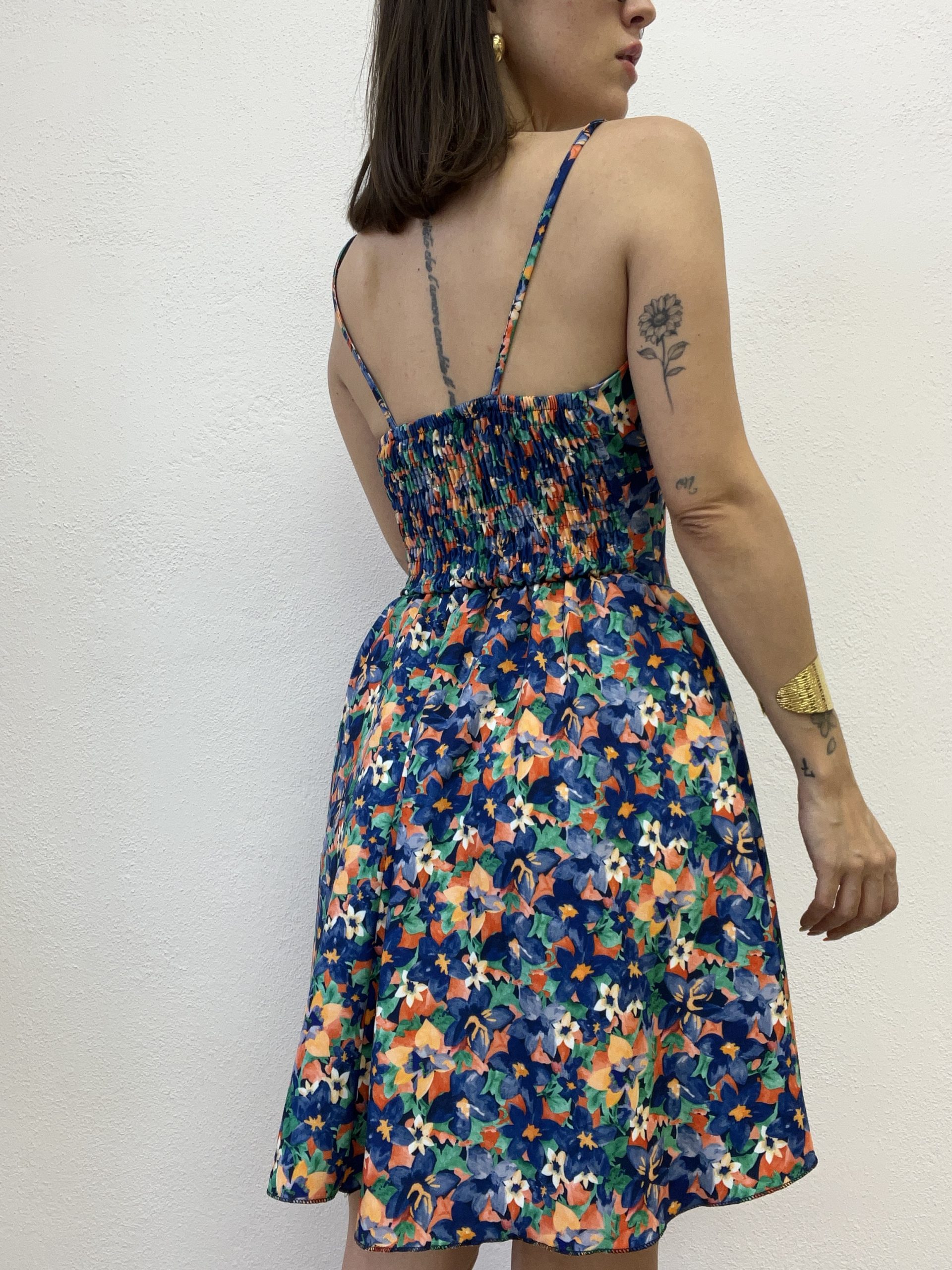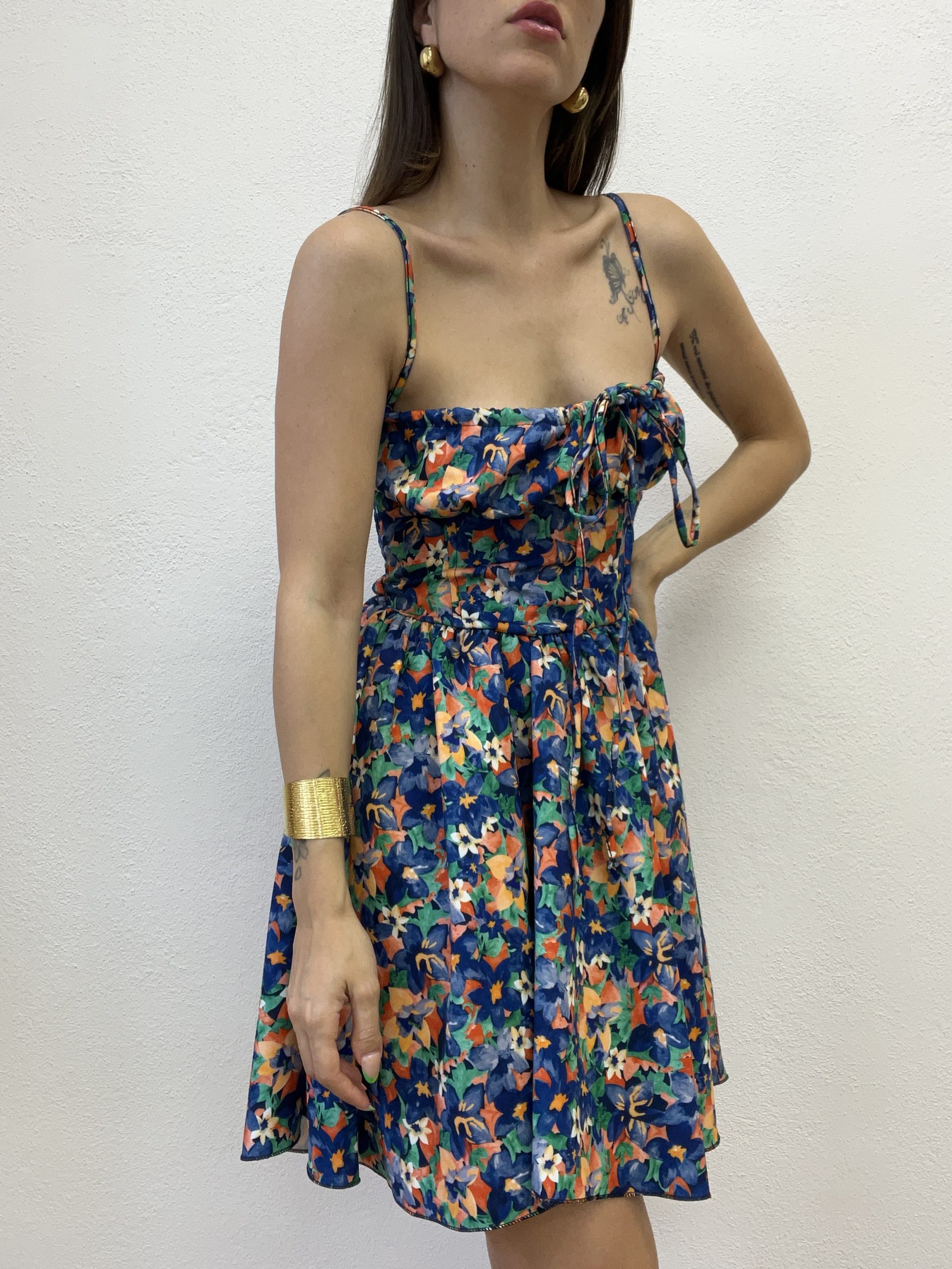 Abito a ruota con stampa fiorata elasticizzato sulla parte posteriore con possibilità di fare un fiocco sulla parte davanti.