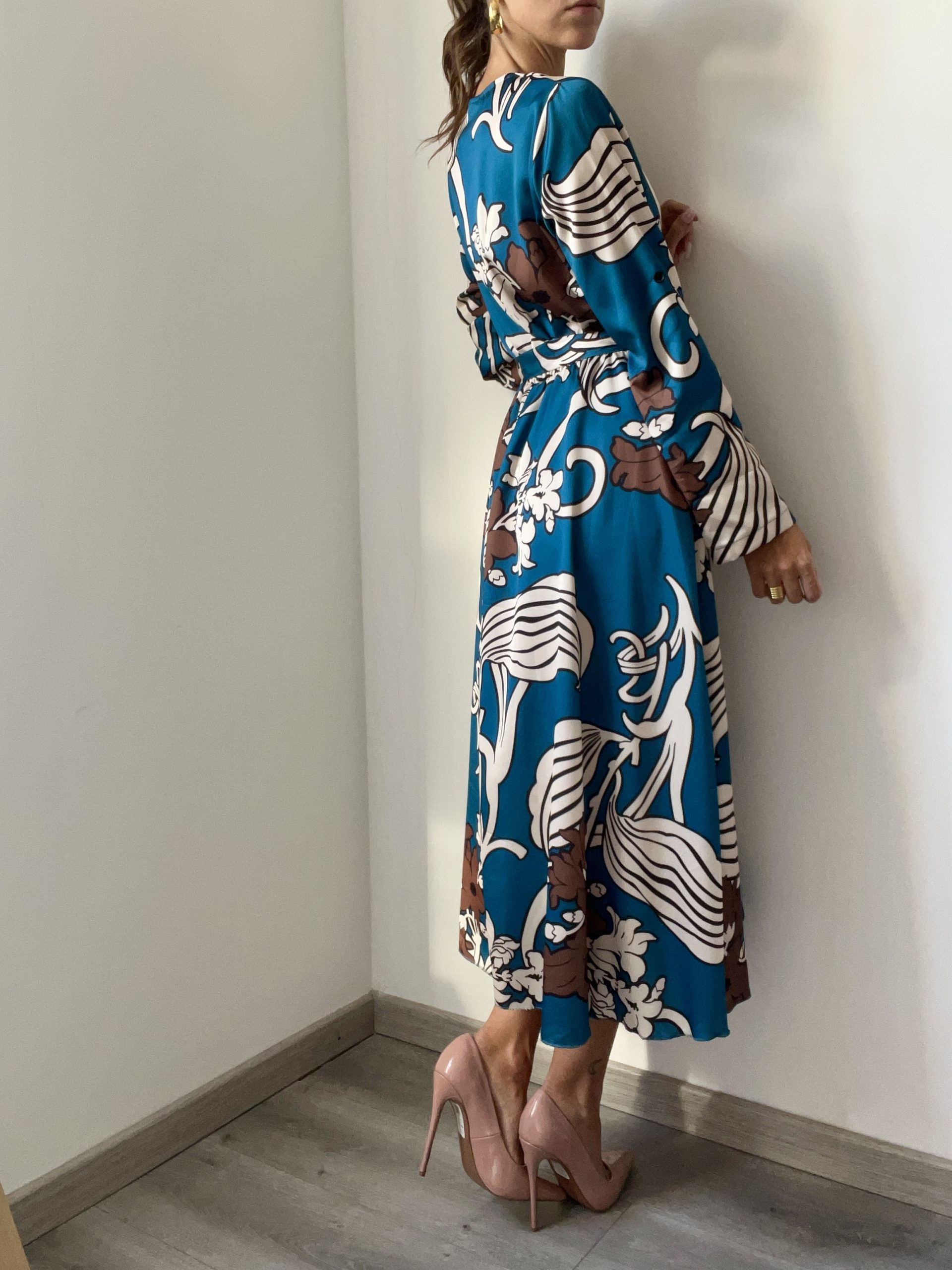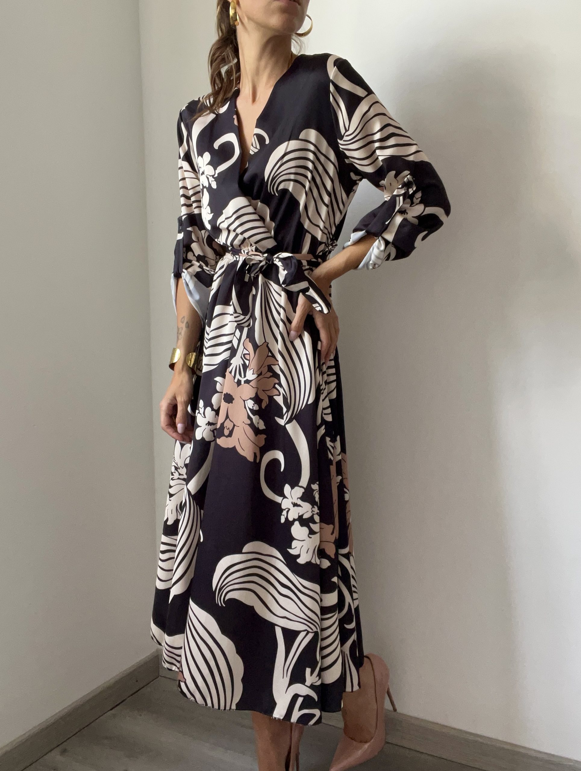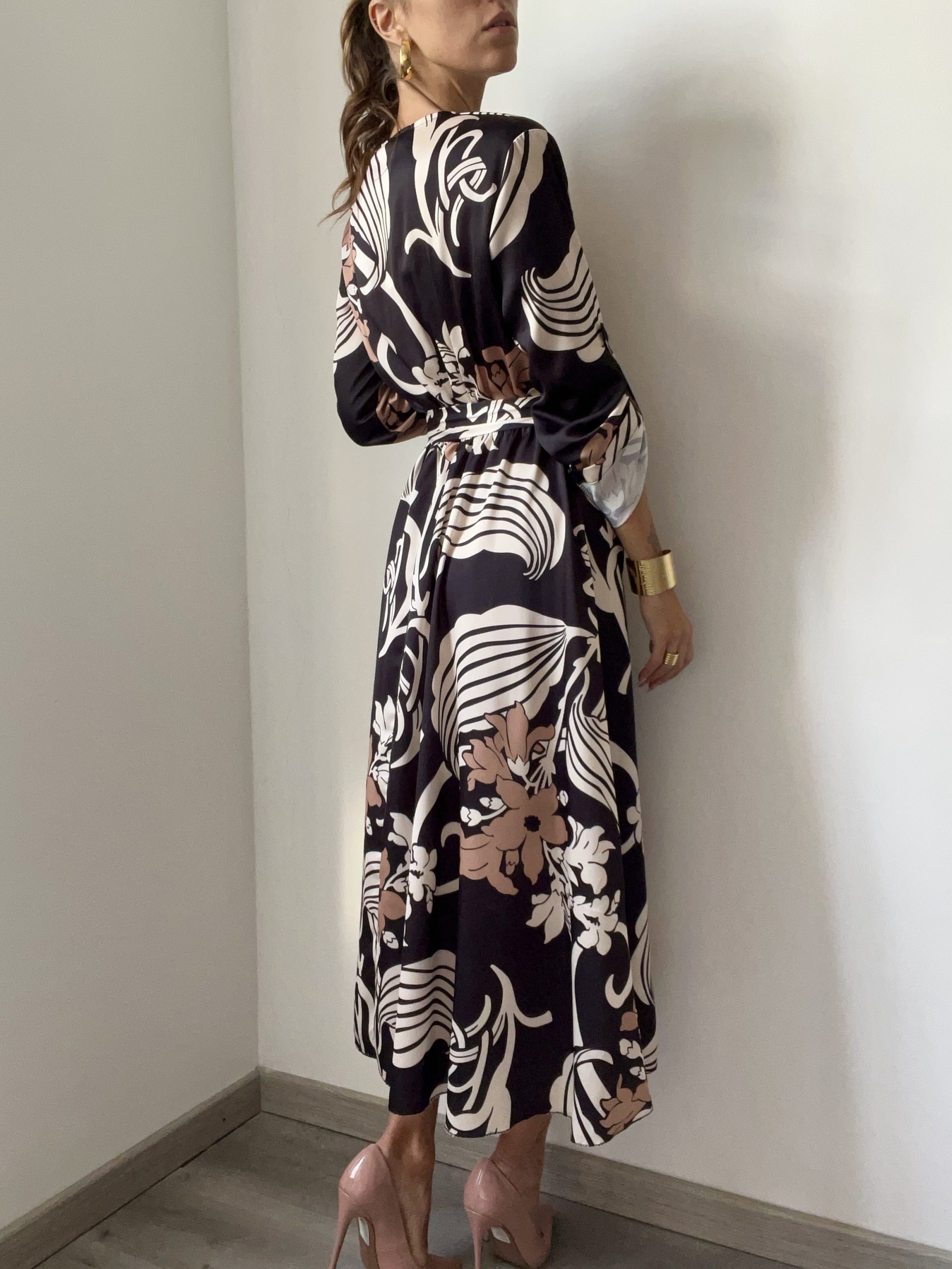 Abito Made in Italy elasticizzato con chiusura incrociata parte superiore e possibilità di arricciare la manica con bottoncino.