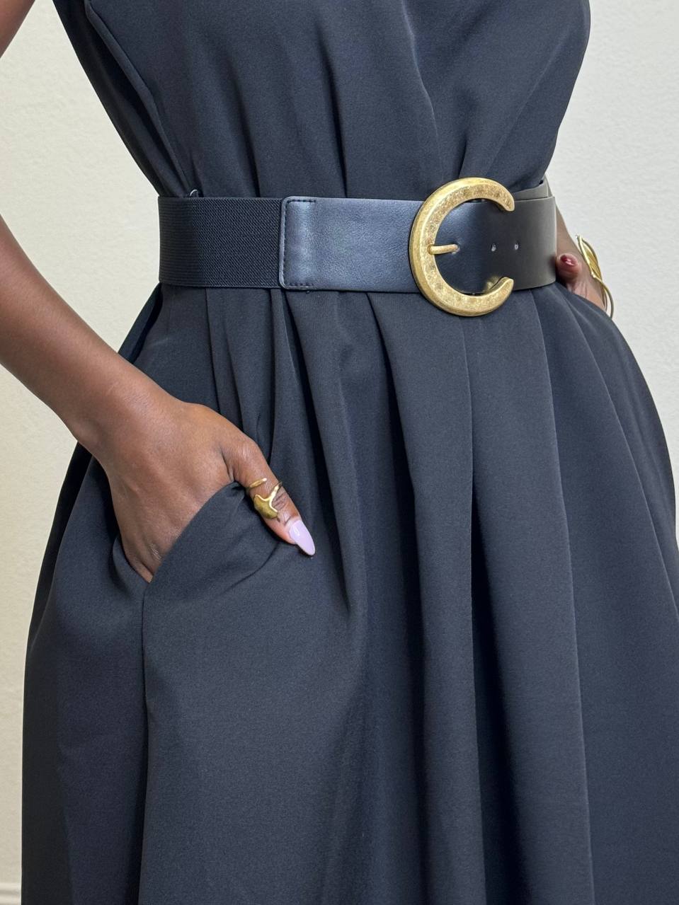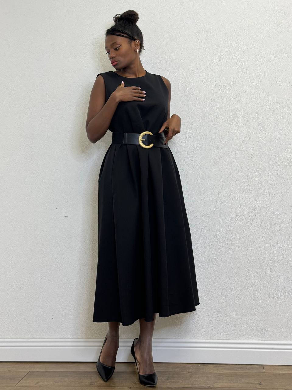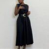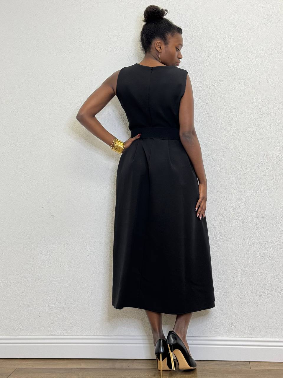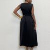 Abito smanicato a girocollo a tinta unita con cinturino incorporato sul punto vita. Chiusura posteriore da cerniera su tutta la lunghezza.