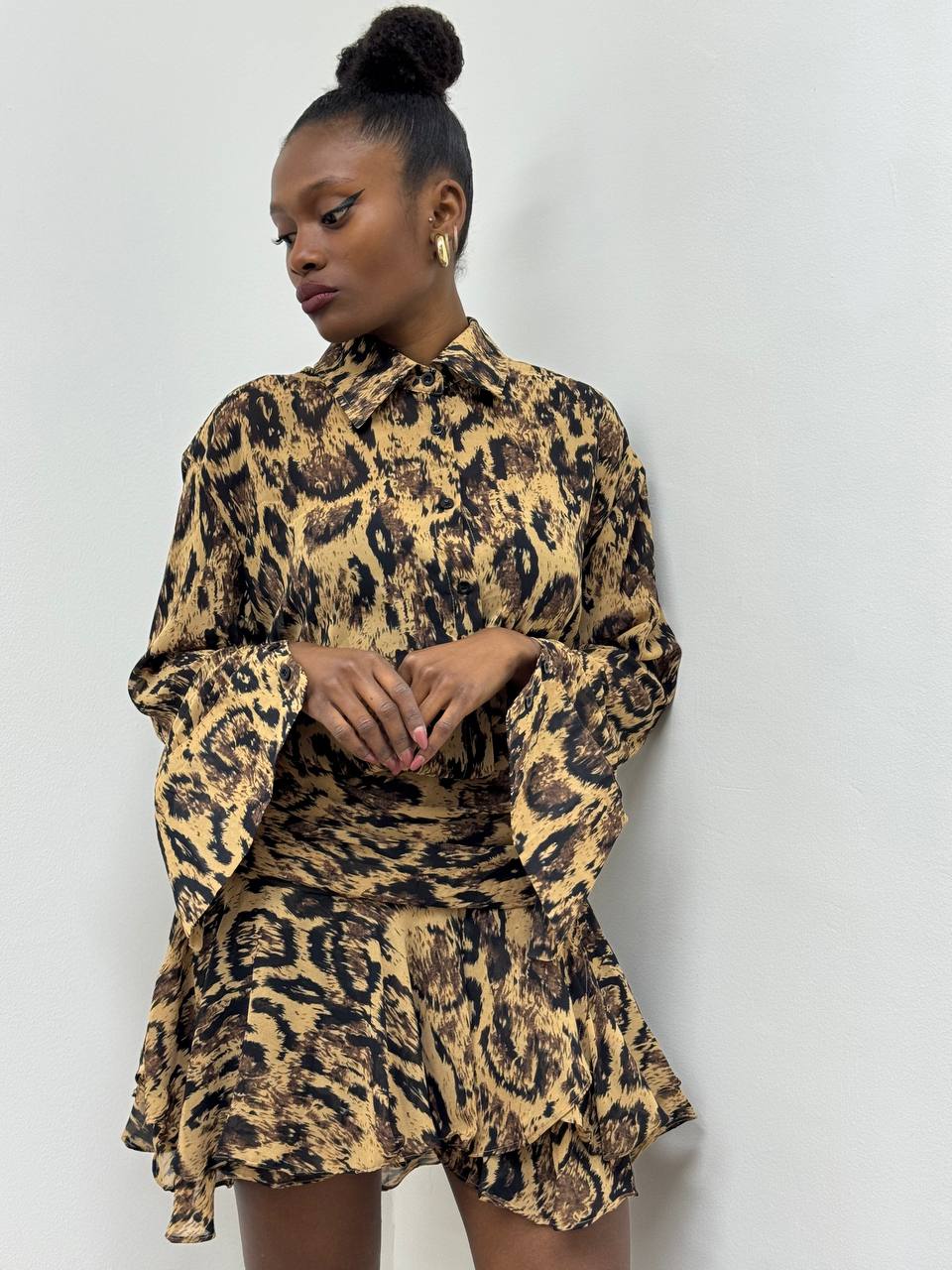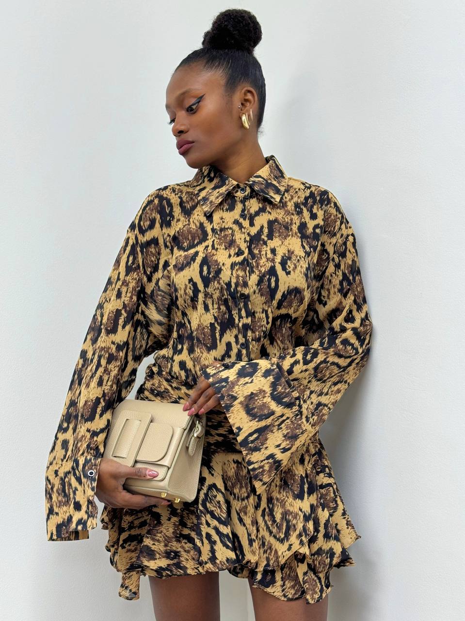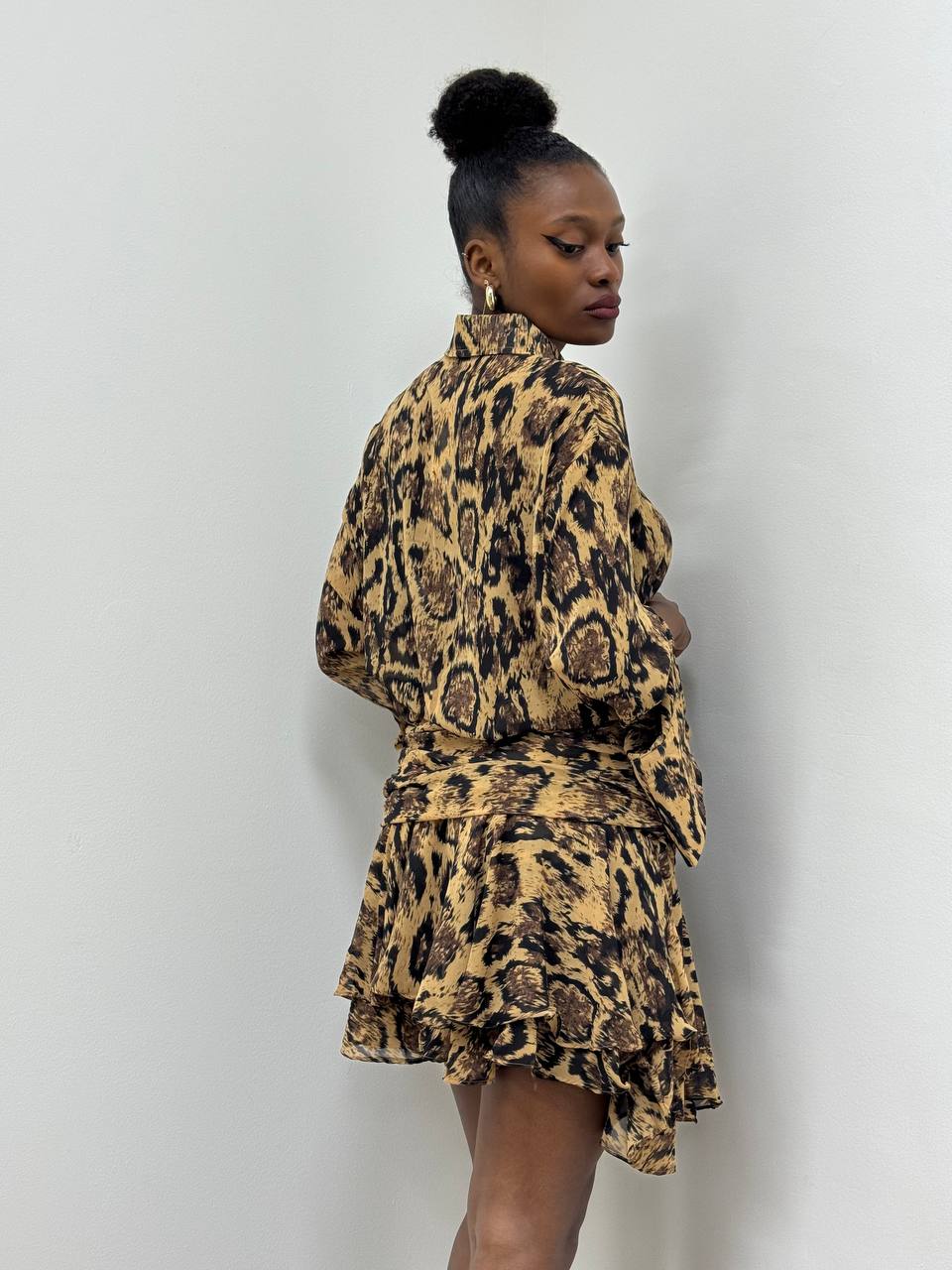 Abito con scollo a V con stampa animalier. Elasticizzato.