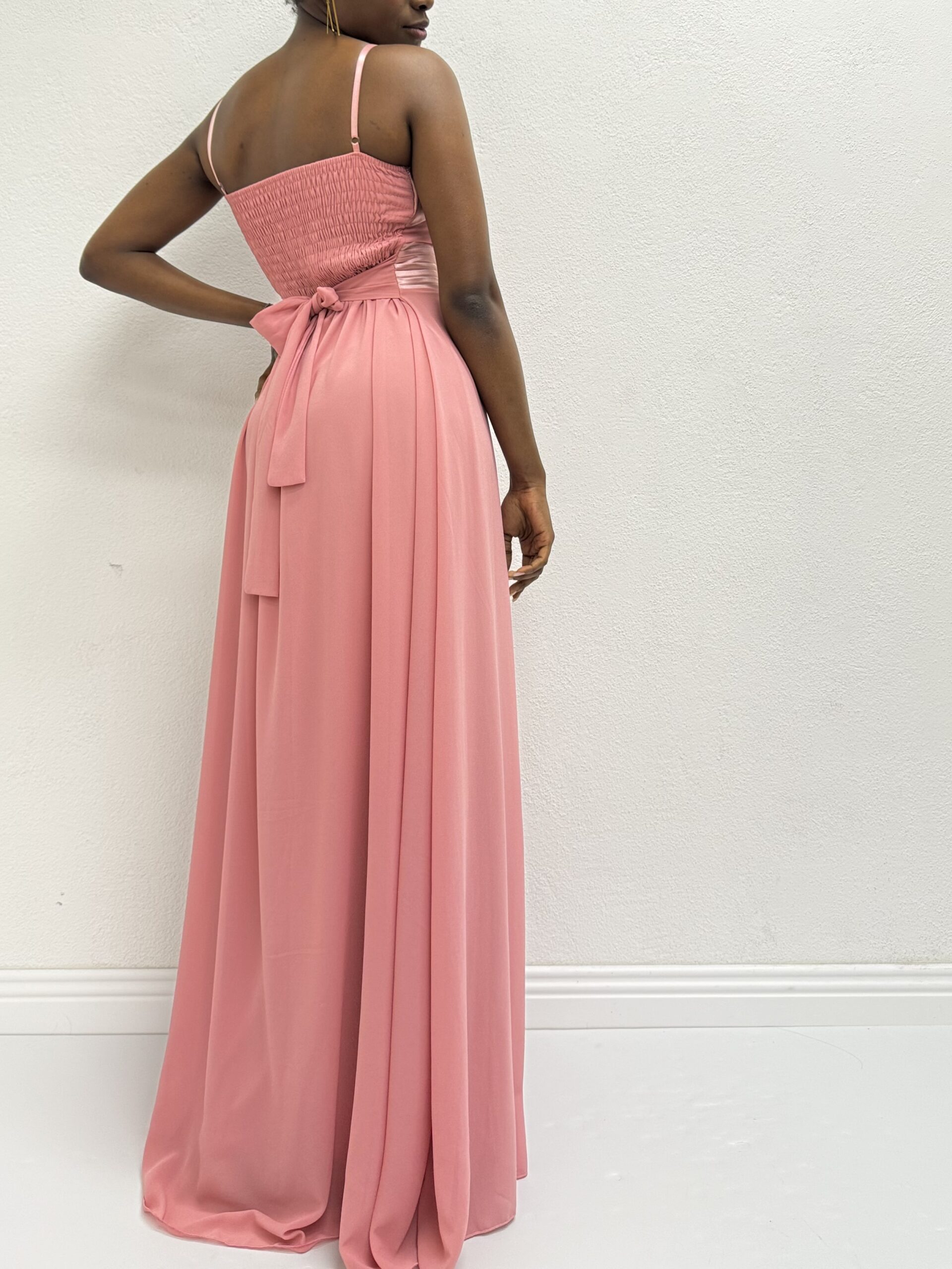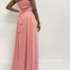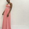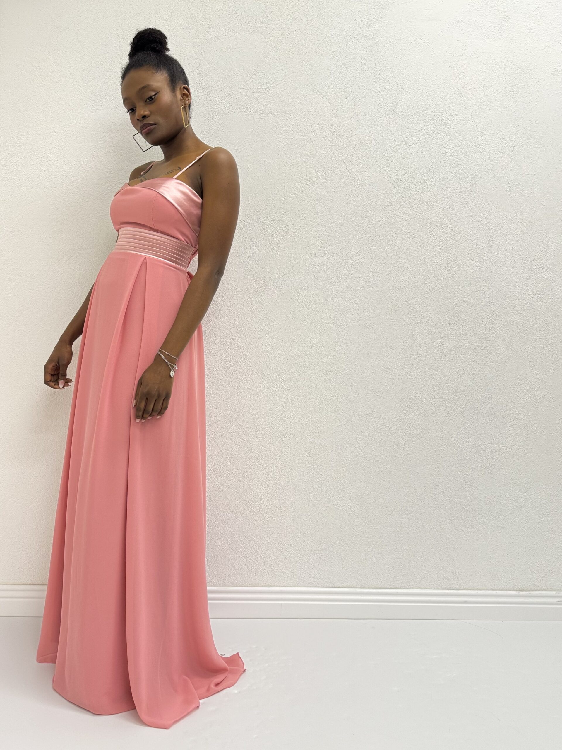 Abito elasticizzato con coppe preformate con dettaglio di pence sulla parte davanti e di una fusciacca sulla parte posteriore