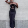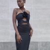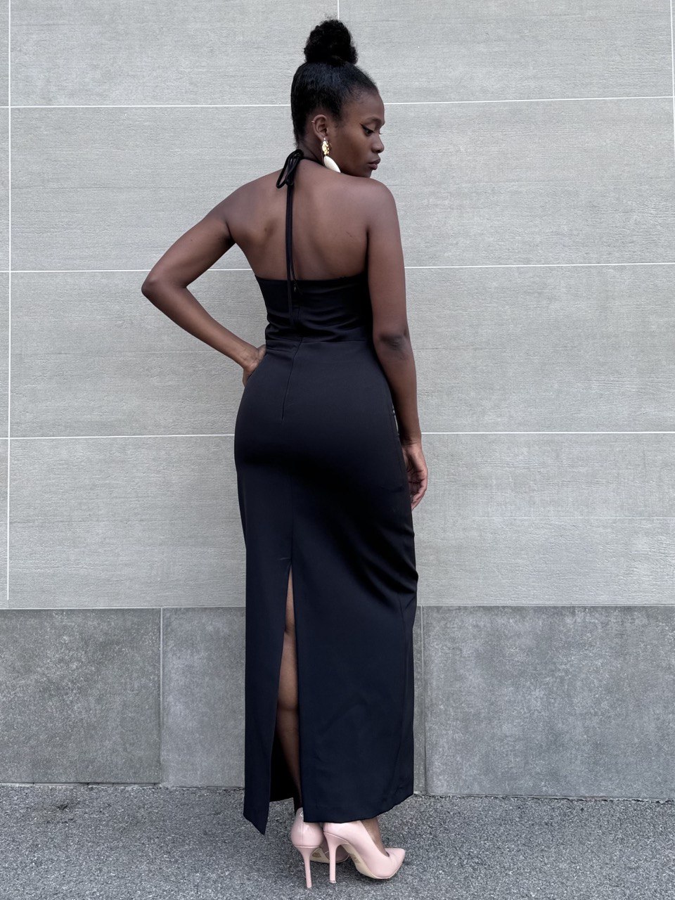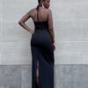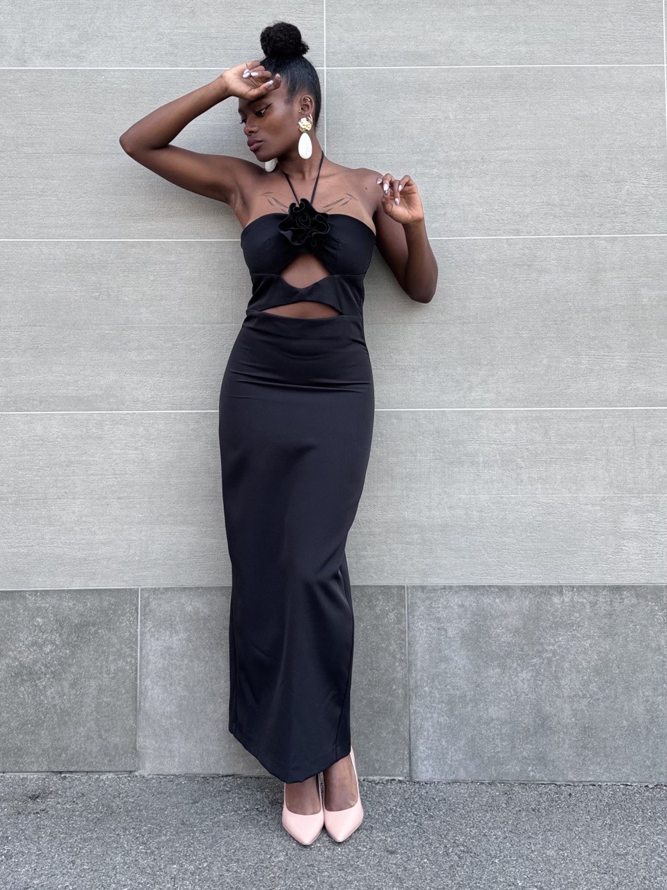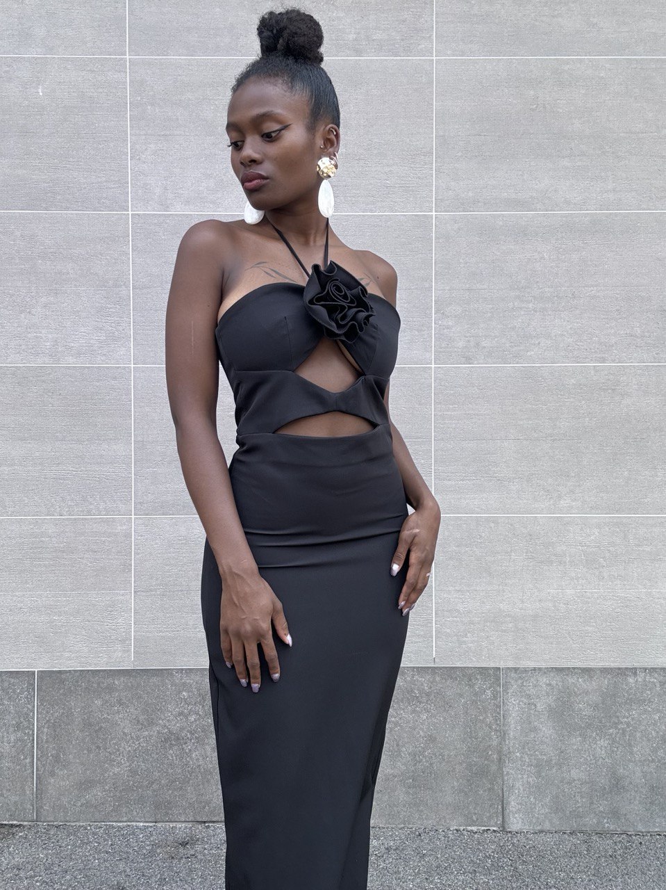 Abito con dettaglio di rosa sulla parte davanti e un piccolo spacchetto con cerniera sulla parte posteriore. Con spacco sulla parte posteriore. Vestibilità aderente nella parte superiore e scende leggermente svasato verso il basso. Adatto per occasioni formali o serali.