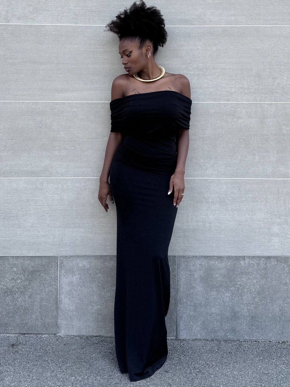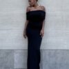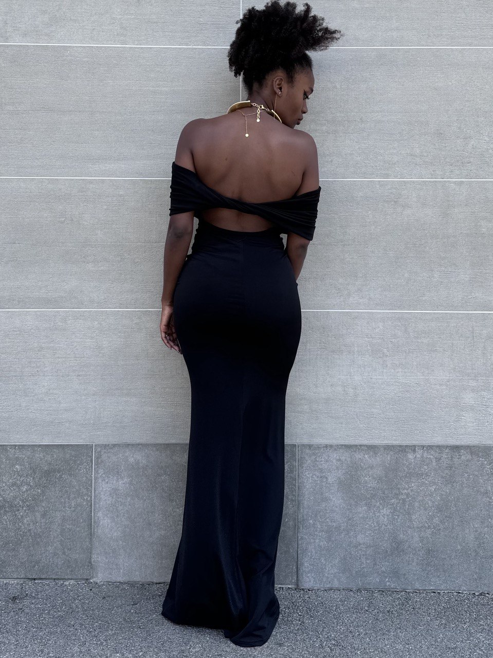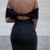 Abito lungo a tinta unita elasticizzato con dettaglio di schiena scoperta. Elasticizzato. Dettaglio di volant sulla parte davanti.