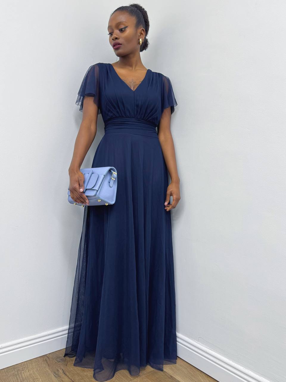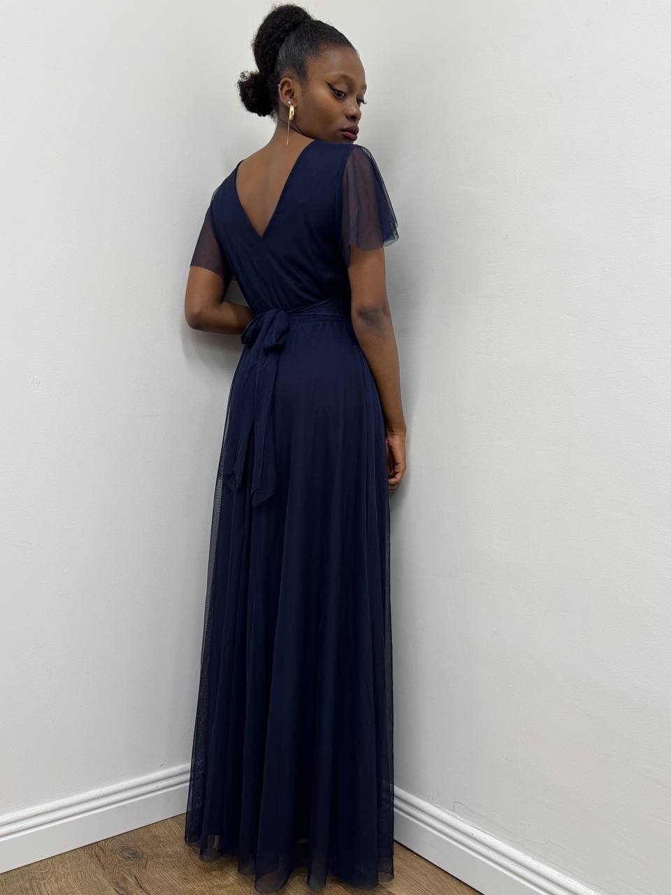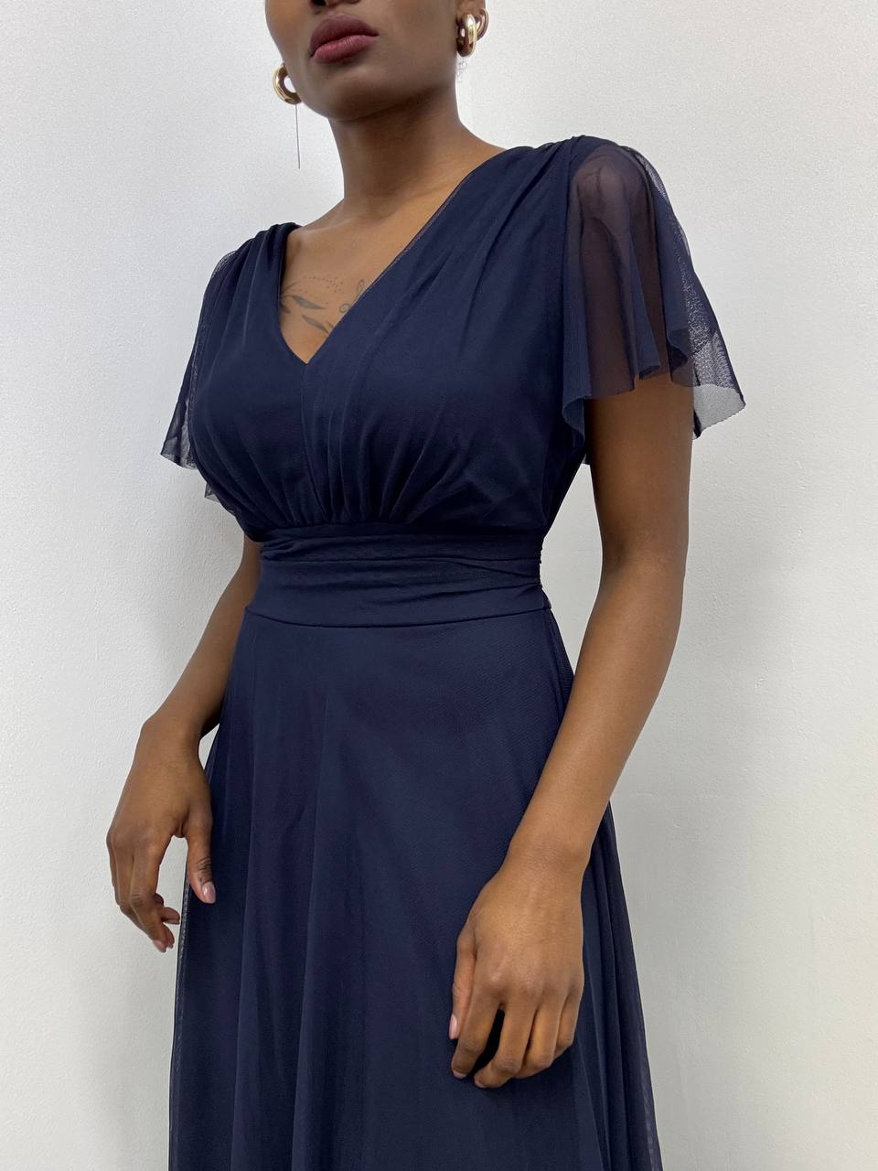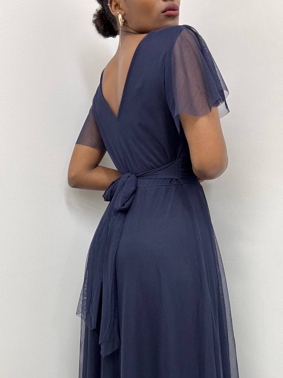 Abito lungo con coppe preformate con volant sulla manica a tinta unita. Dettaglio di cinturino tono su tono. Foderata internamente.