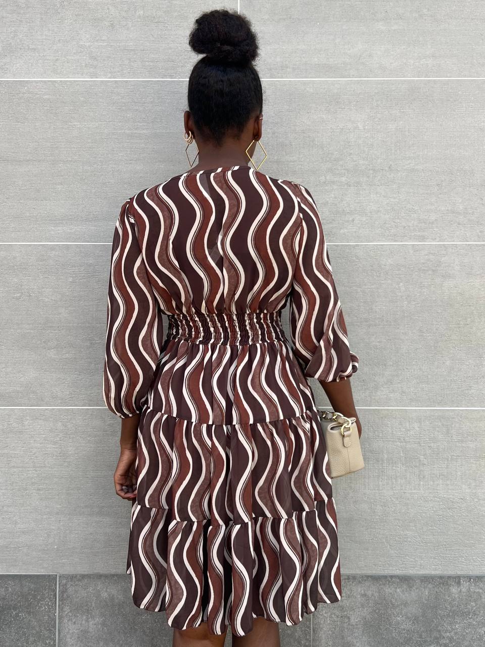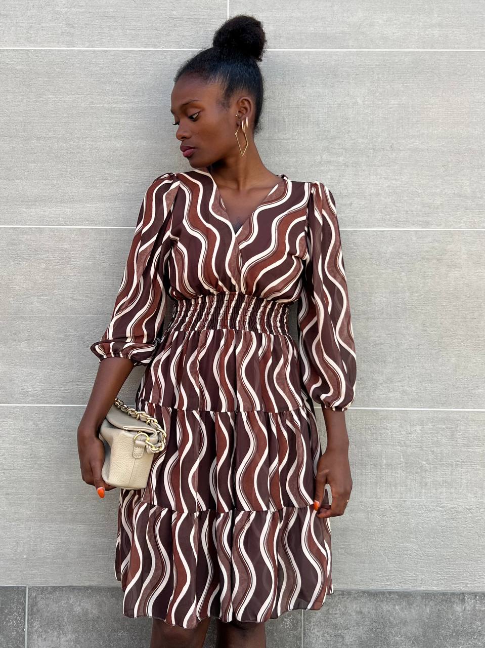 Abito con scollo a V elasticizzato con stampa su tutta la lunghezza. Foderato internamente.