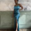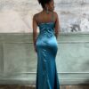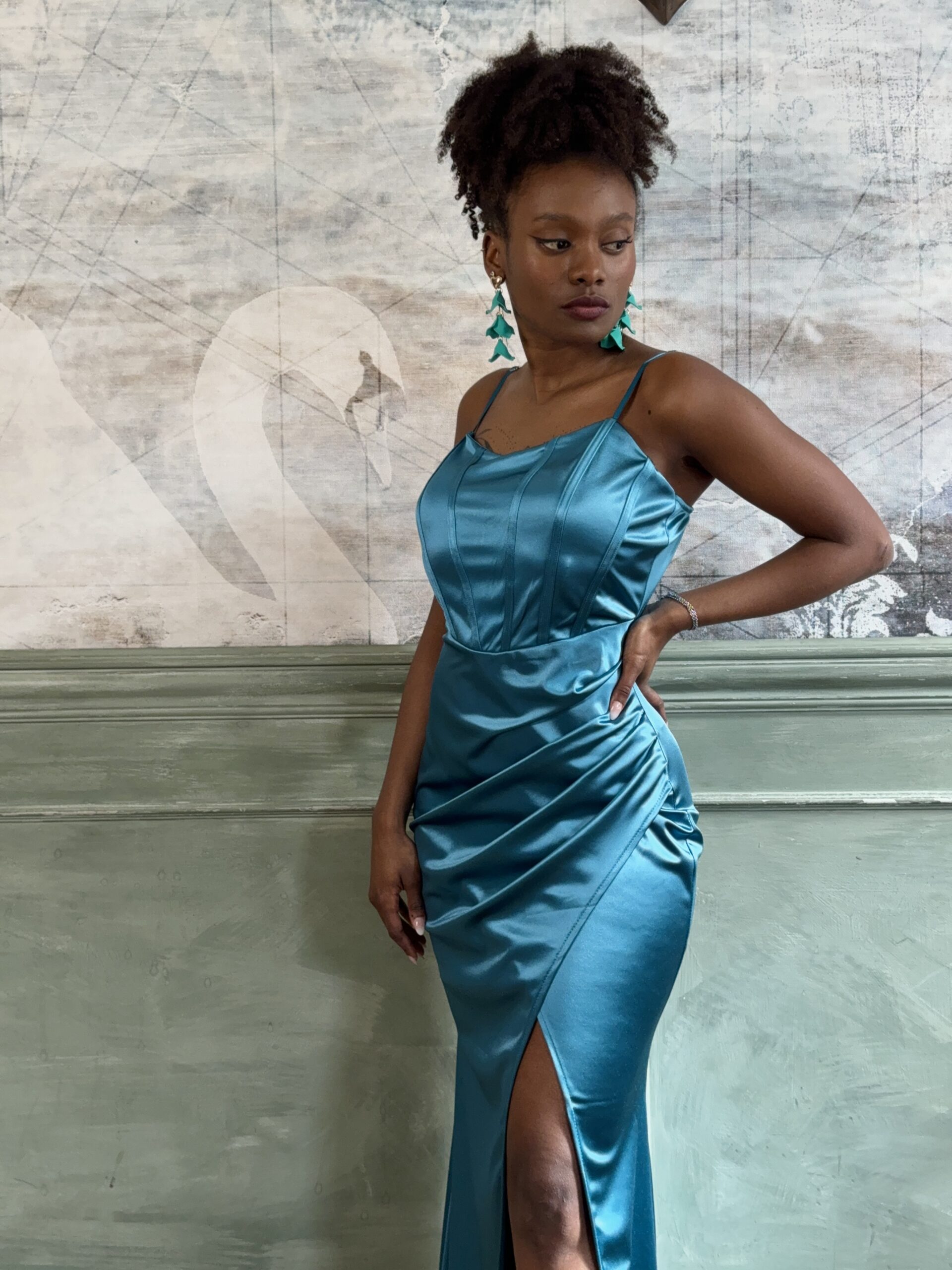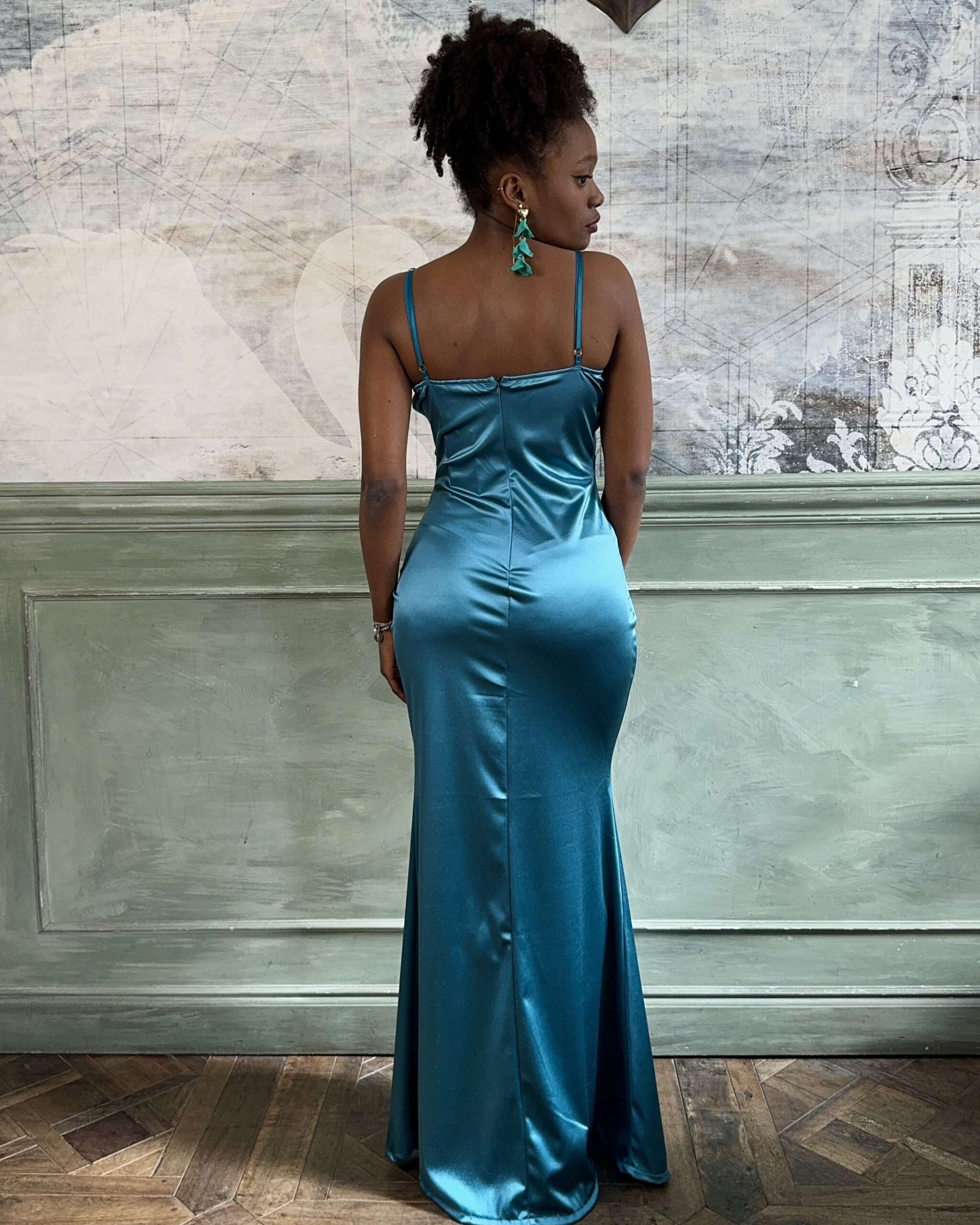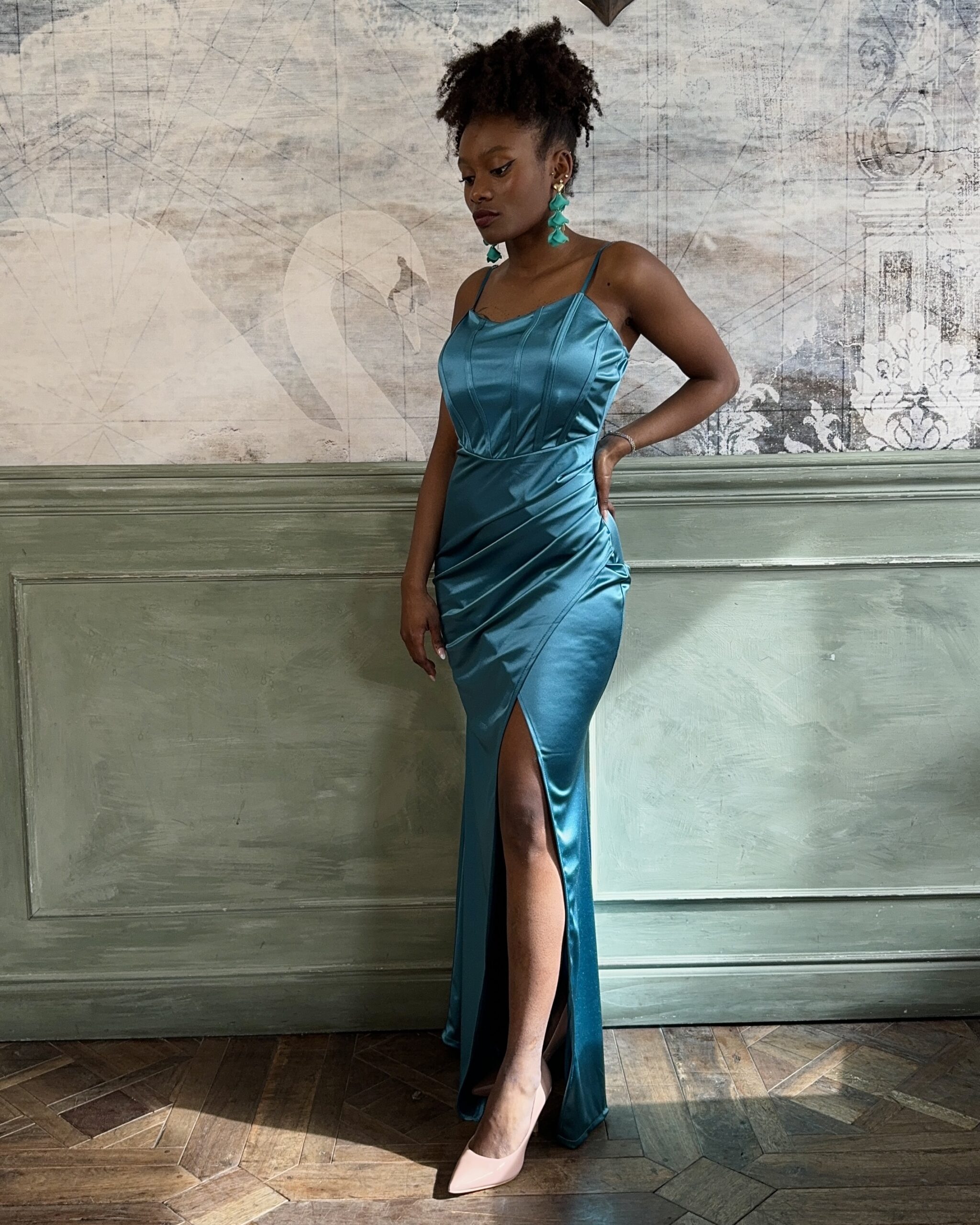 Abito lungo con spallina regolabile con dettaglio di pince su tutta la lunghezza.