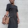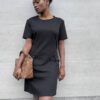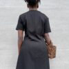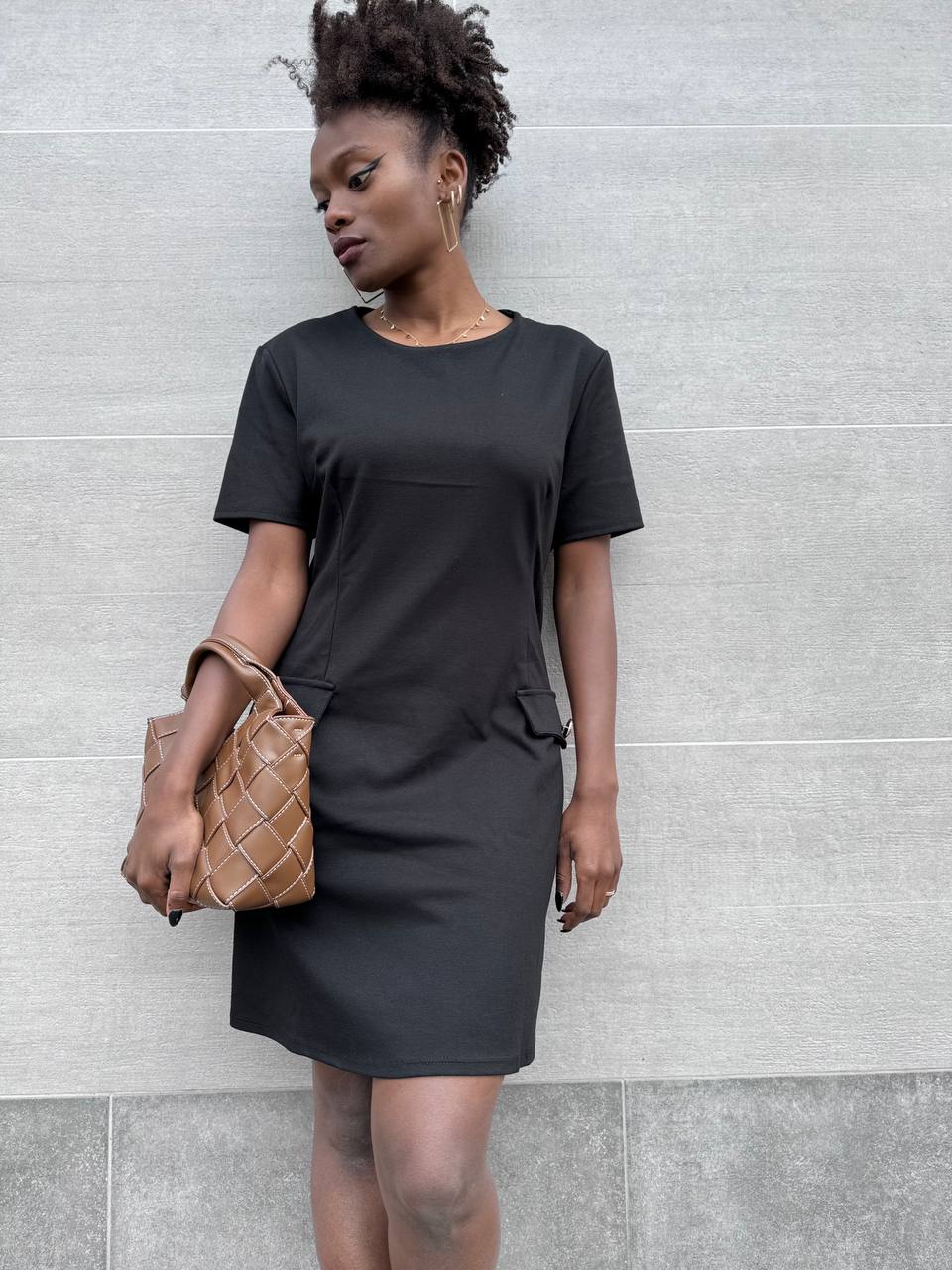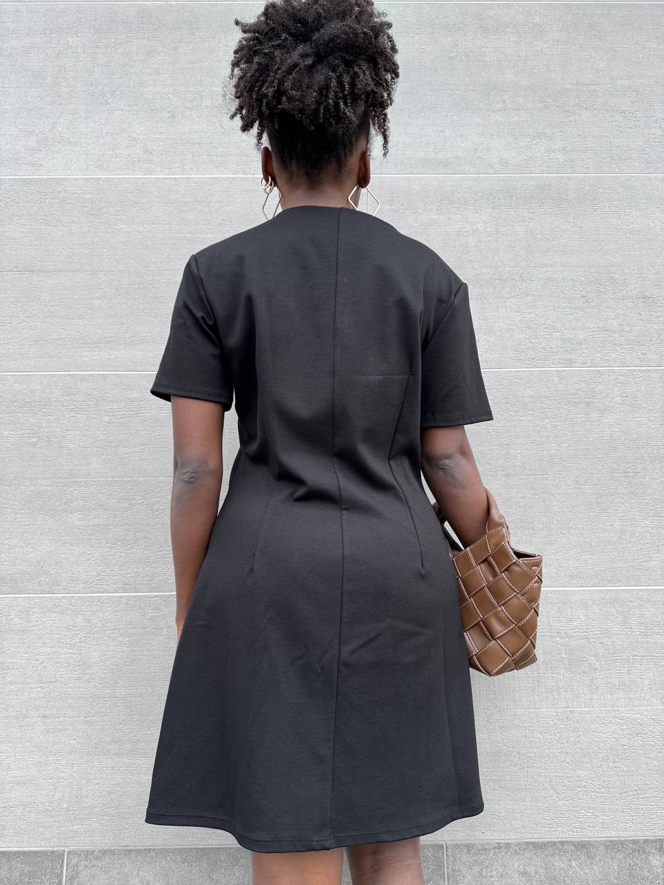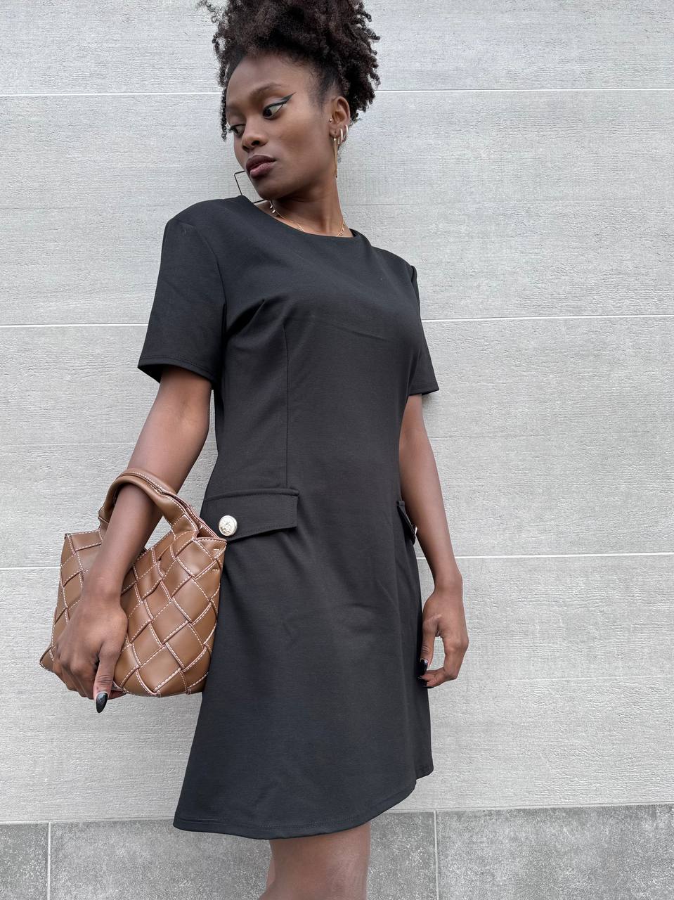 Abito a manica corta a tinta unita, con finte taschine sulla parte finale. Dettaglio di bottone goffrato in argento.