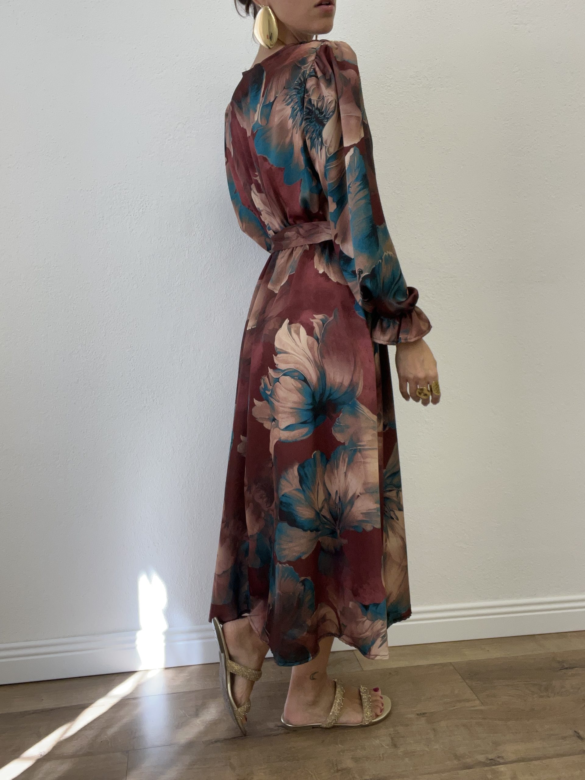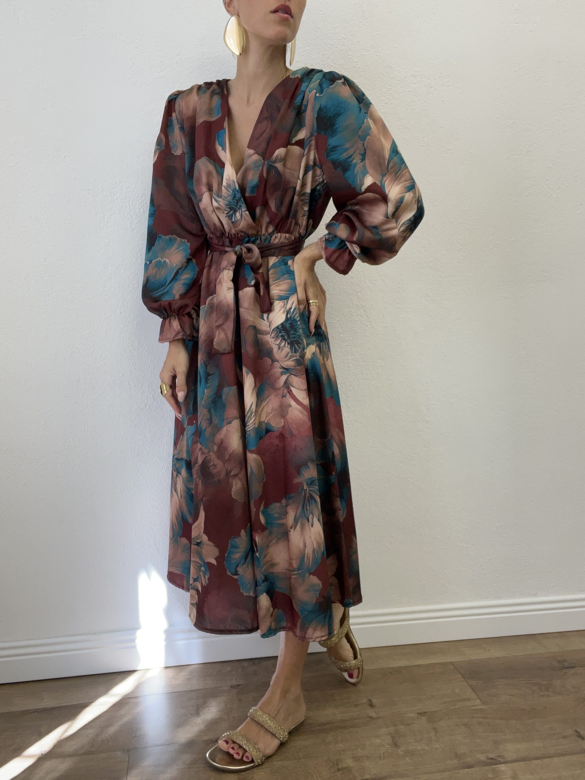 Abito elasticizzato lungo con scollo a V incrociato con cinturino tono su tono. Elasticizzato sui polsini.