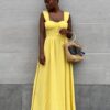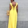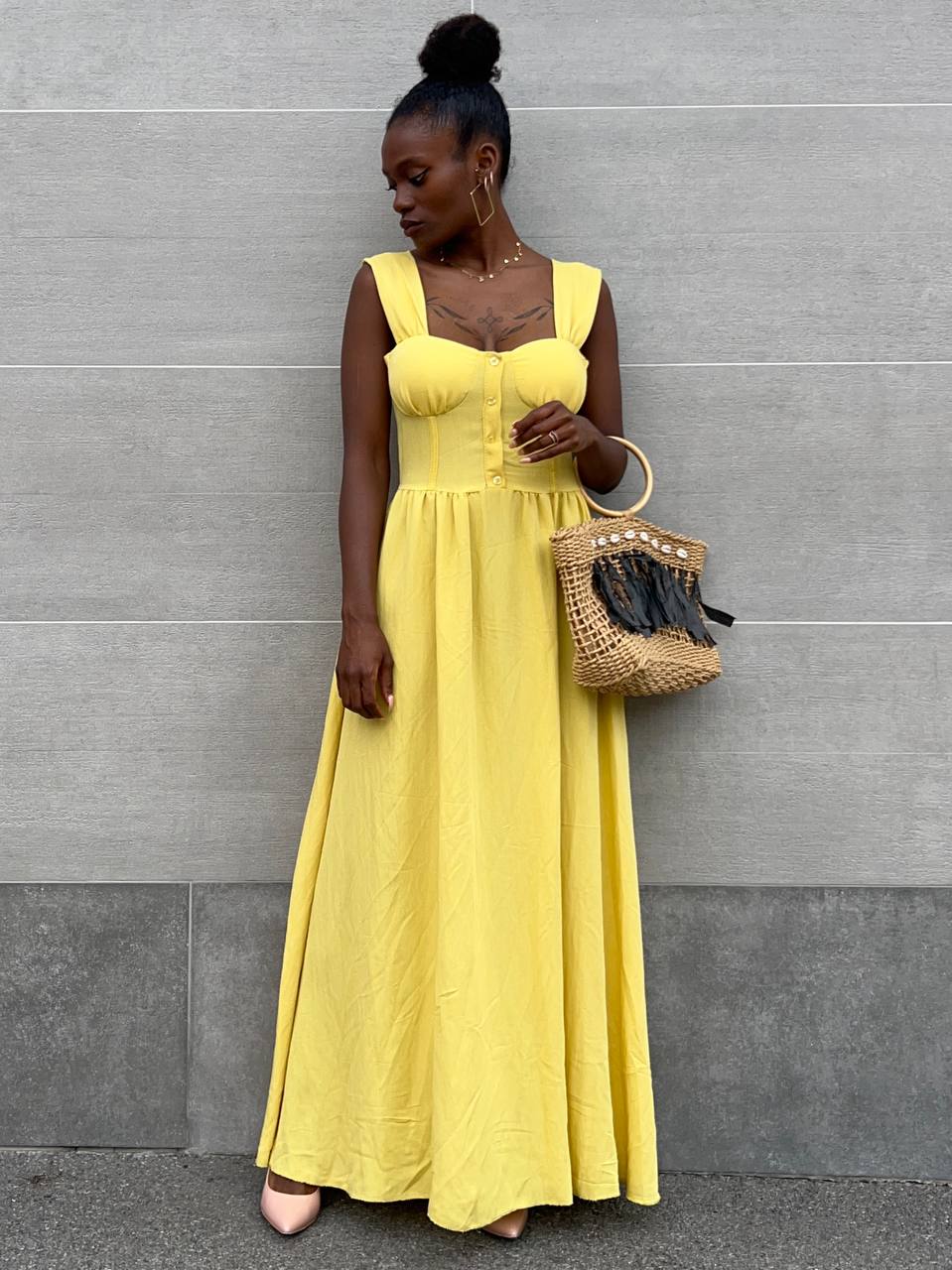 Abito con spalline larghe con coppe preformate con dettaglio di bottoni sulla parte centrale a tinta unita.