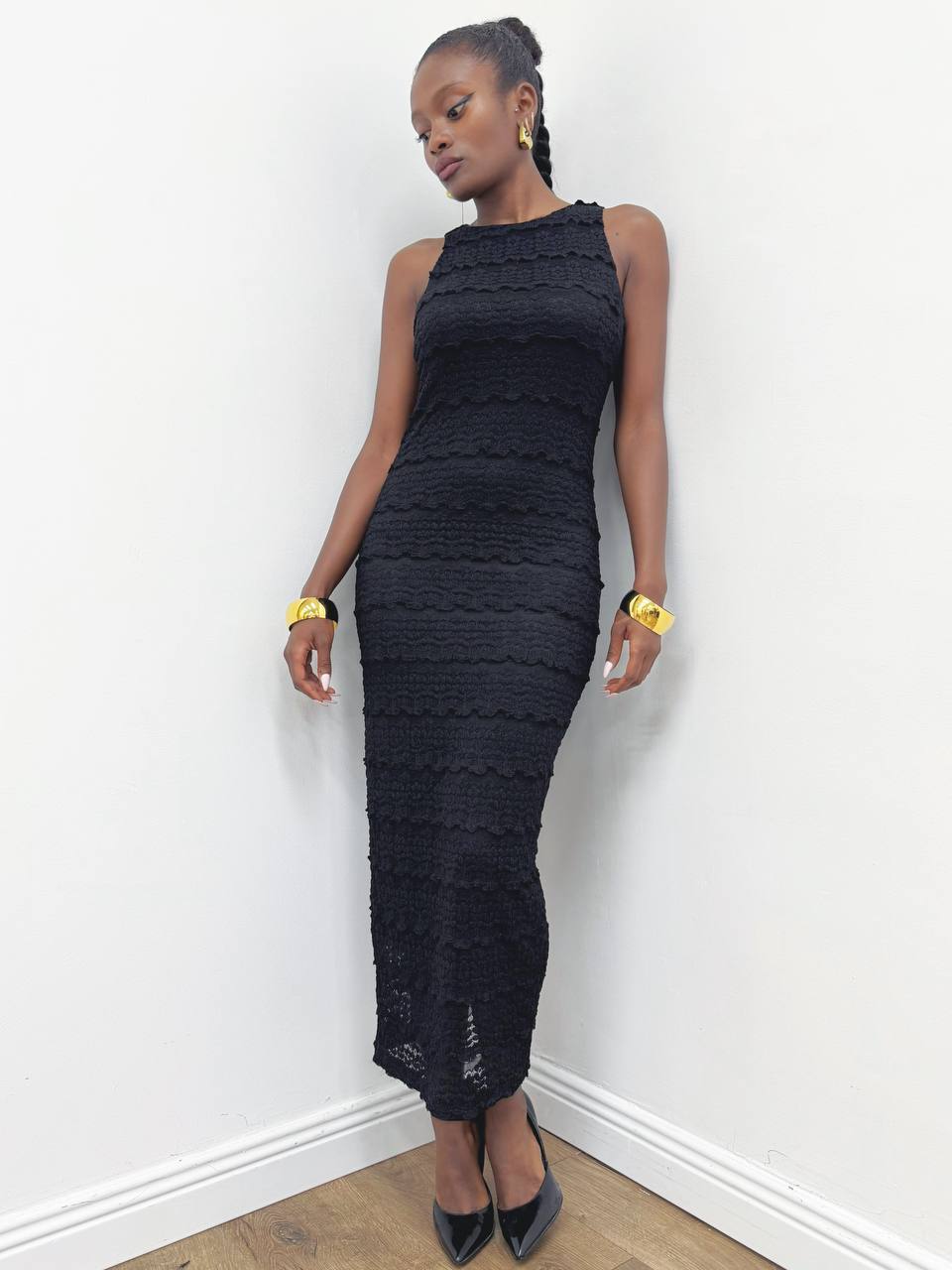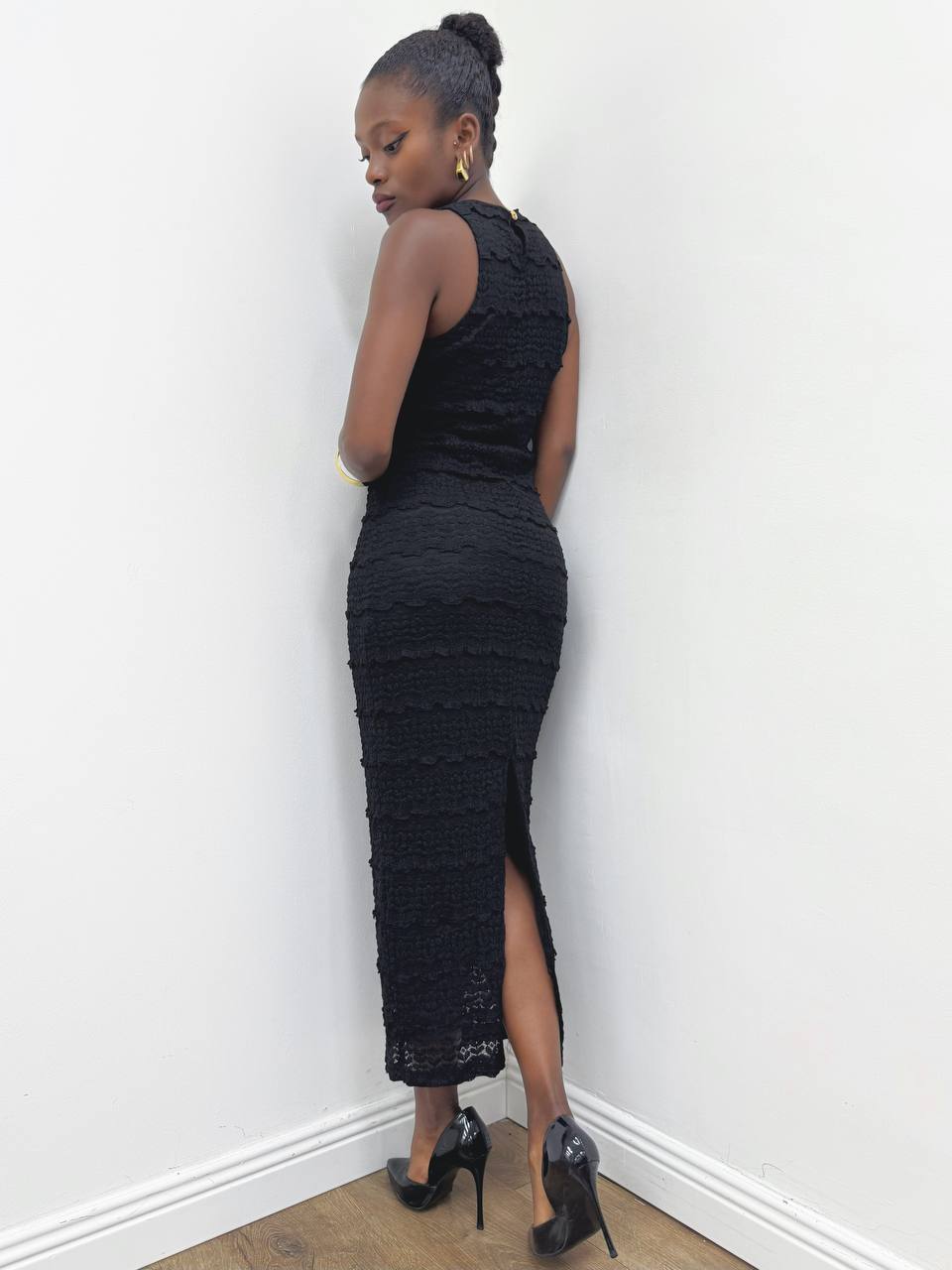 Abito smanicato lungo in maglina tridimensionale molto dettagliata con dettaglio di pizzo su tutta la lunghezza. Chiusura a goccia posteriore da bottoncino. Spacco posteriore che agevola il movimento .Foderato internamente.