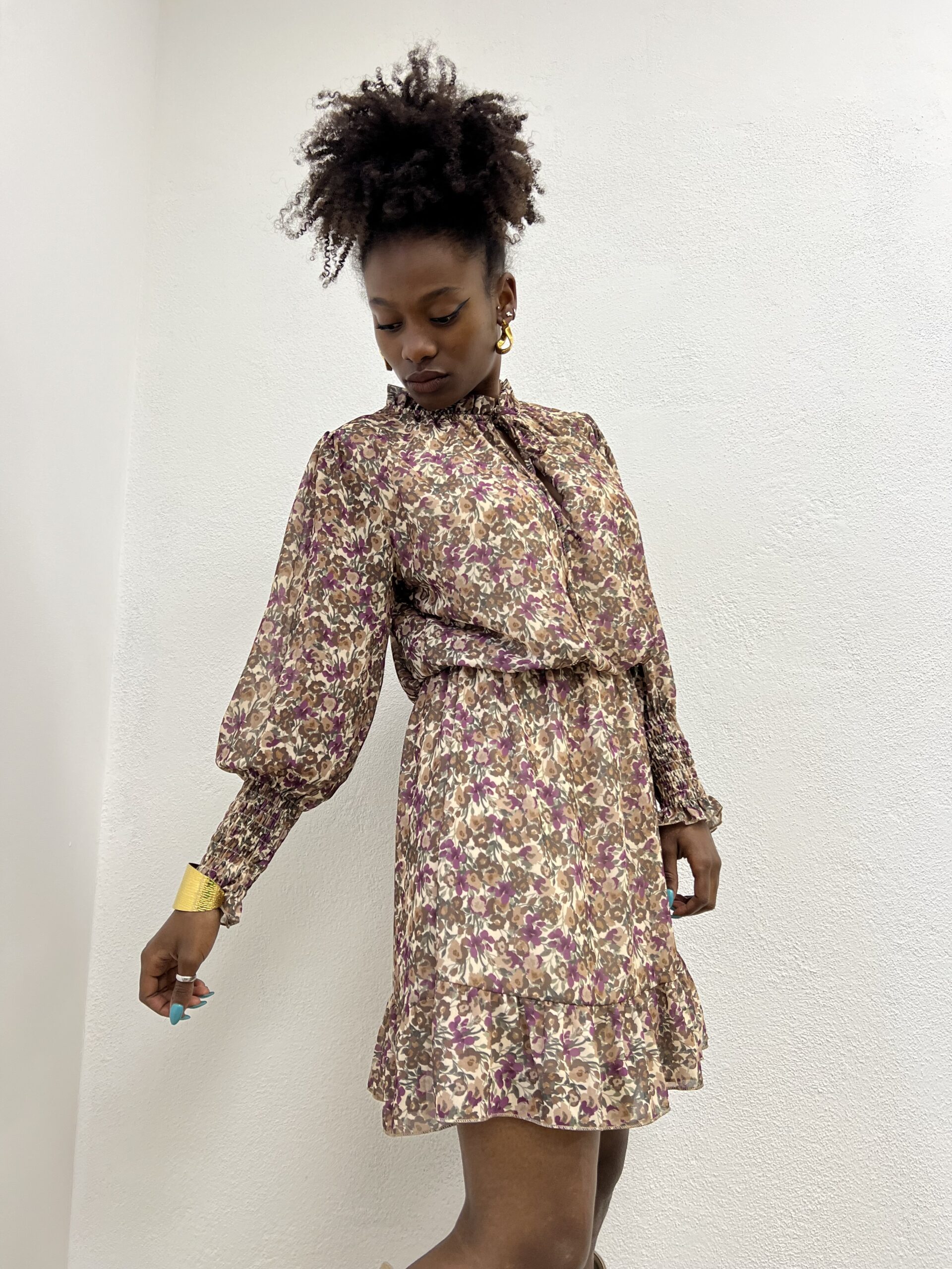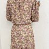Abito a girocollo elasticizzato sia sul punto vita che sui polsini. Fiocco di chiusura sulla parte del collo con piccole rose stampate. Foderato internamente.