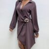 Questo abito a portafoglio unisce eleganza e femminilità con un design intramontabile. Caratterizzato da una chiusura incrociata sul davanti, è dotato di colletto classico e maniche lunghe, per uno stile raffinato e adatto a diverse occasioni. Il punto vita è valorizzato da una fibbia decorativa color oro, dalla forma irregolare e organica, posizionata lateralmente proprio dove si incontrano i lembi del vestito, donando un tocco scultoreo e contemporaneo al capo. La silhouette avvolgente esalta le forme in modo naturale, garantendo comfort e stile.