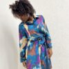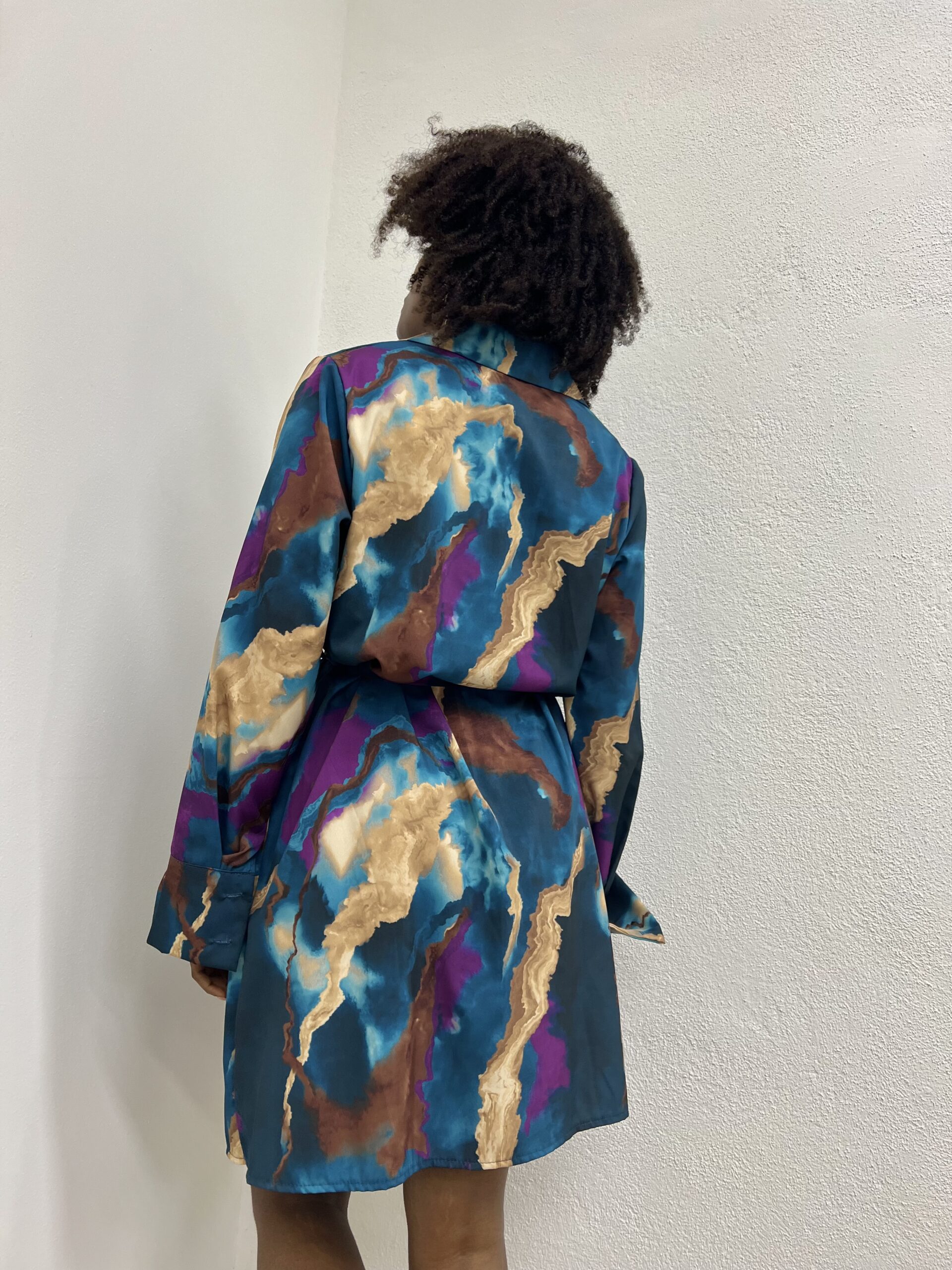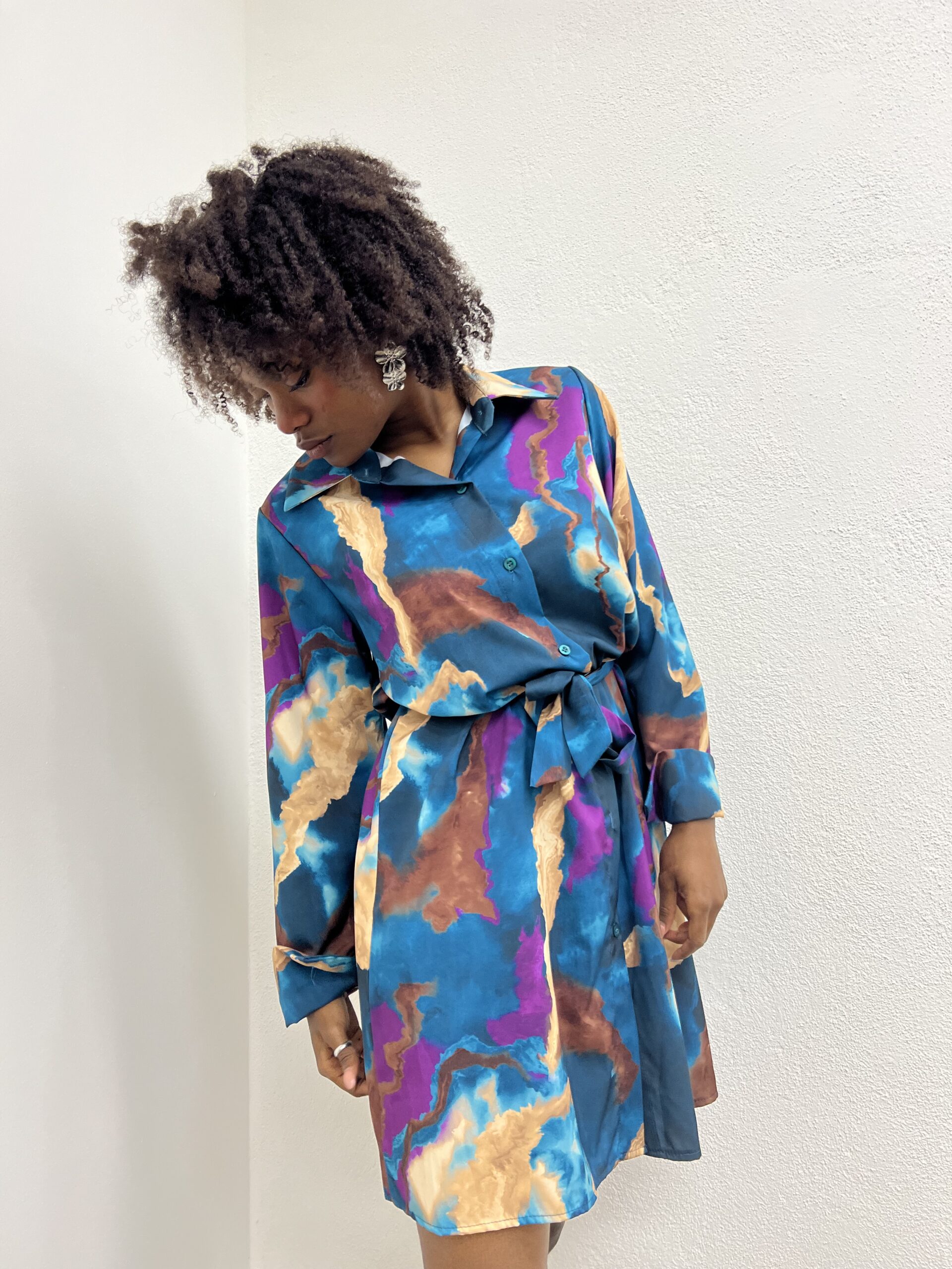 Abito lungo con chiusura centrale di bottoni con cinturino sul punto vita tono su tono con stampa.
