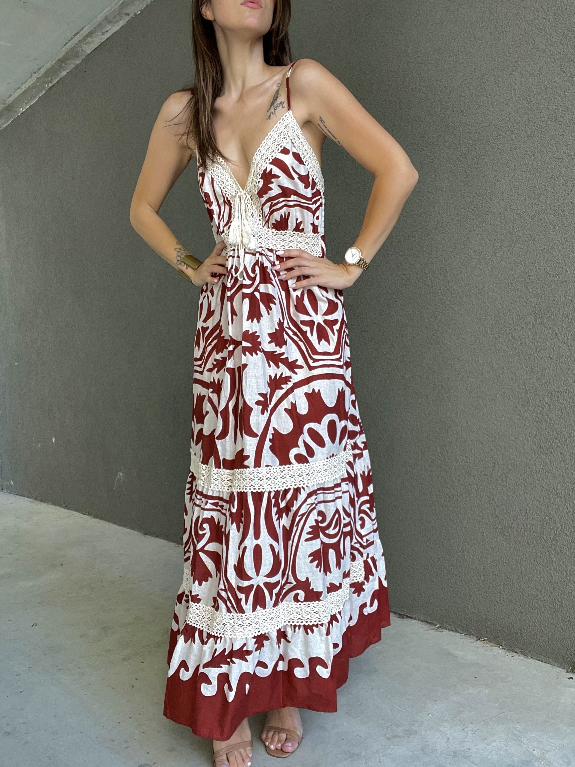 Abito con scollo a V caratterizzato da pizzo macrame. Tessuto leggero e scivolato. Veste da taglia 38 a taglia 48.