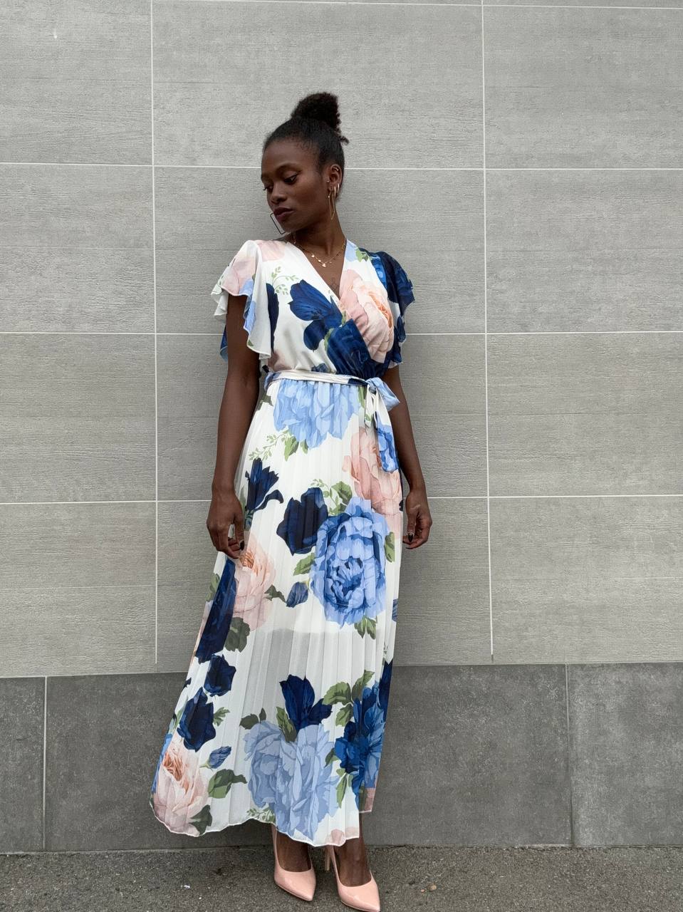 Abito con manica a volant plissettato con stampa su tutta la lunghezza. Cinturino tono su tono.
