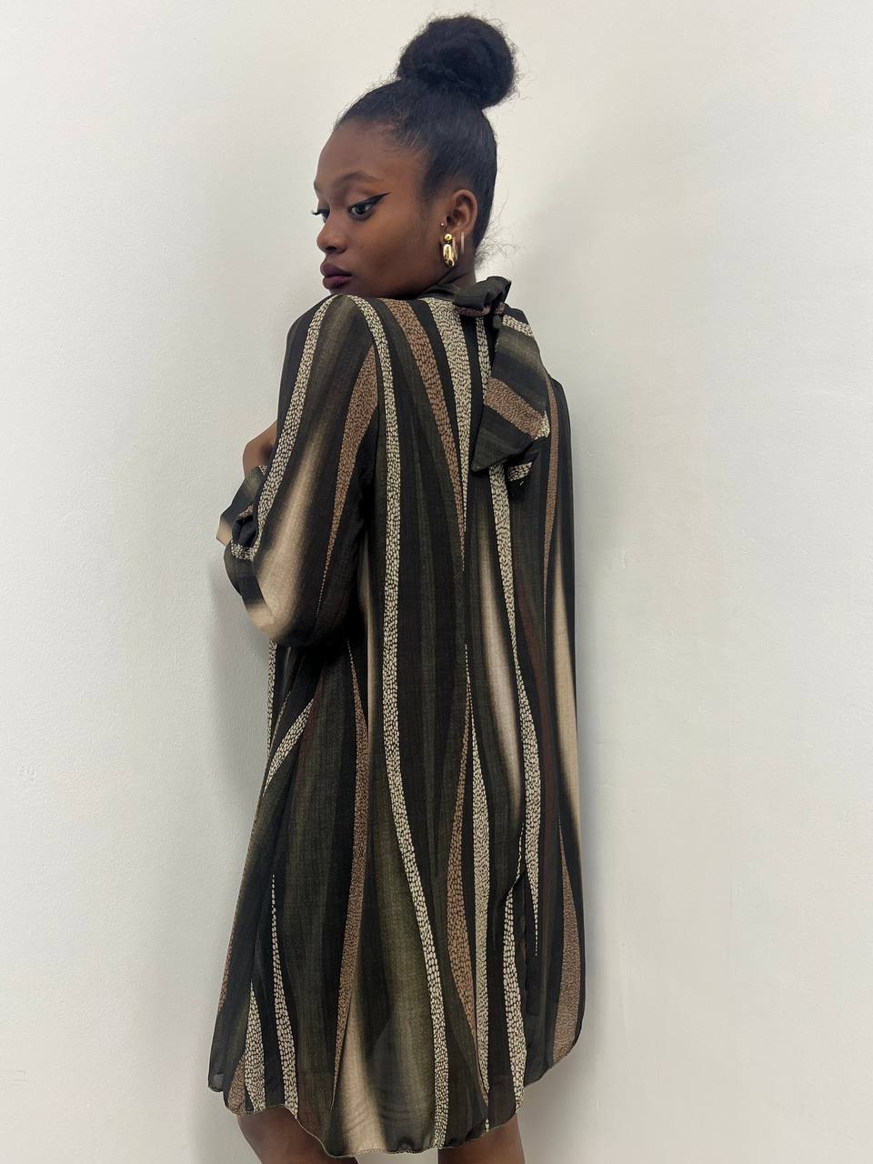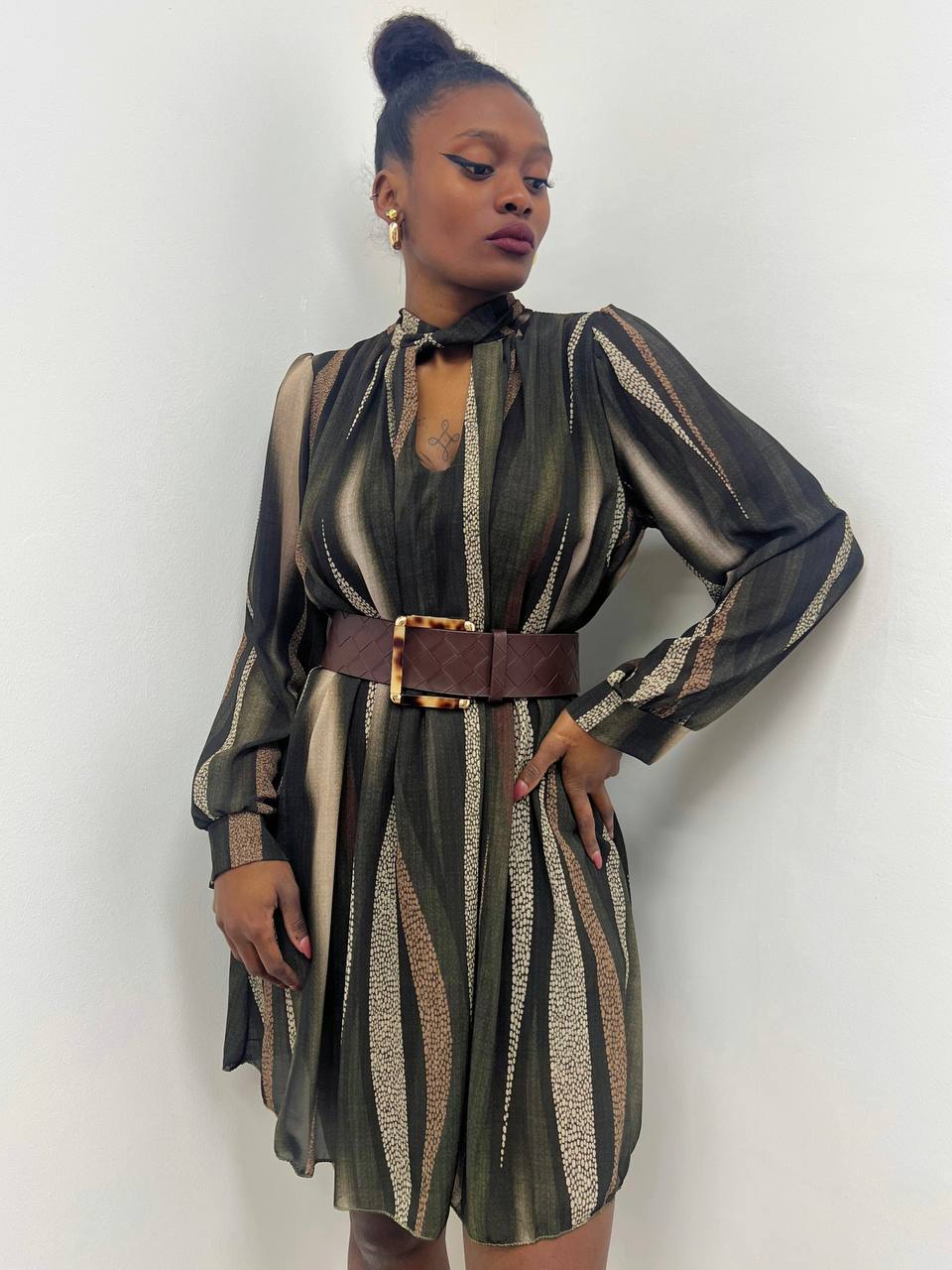 Abito elasticizzato con stampa geometrica su tutta la lunghezza con scollo a goccia con chiusa a lembo. Foderato internamente.