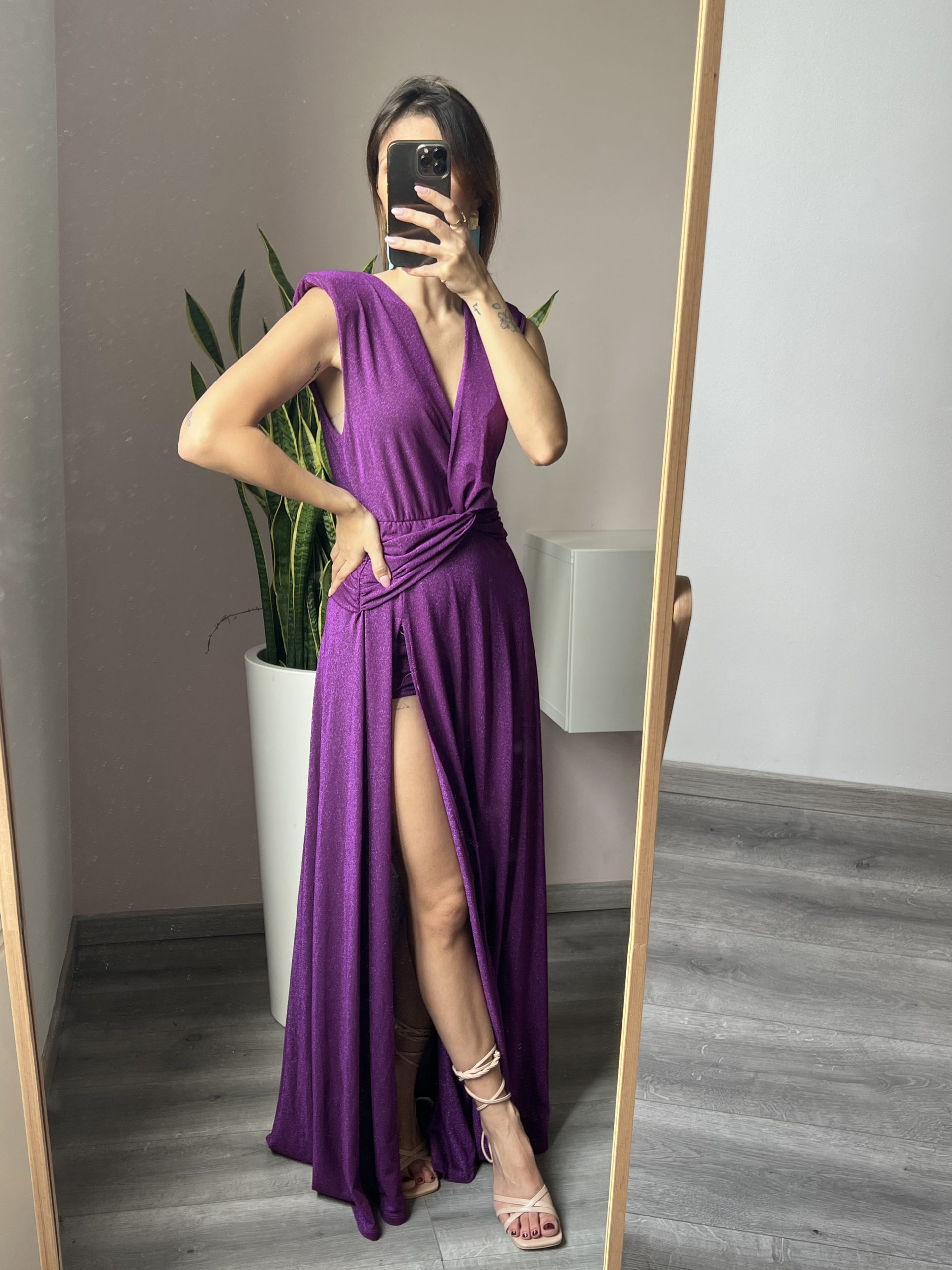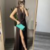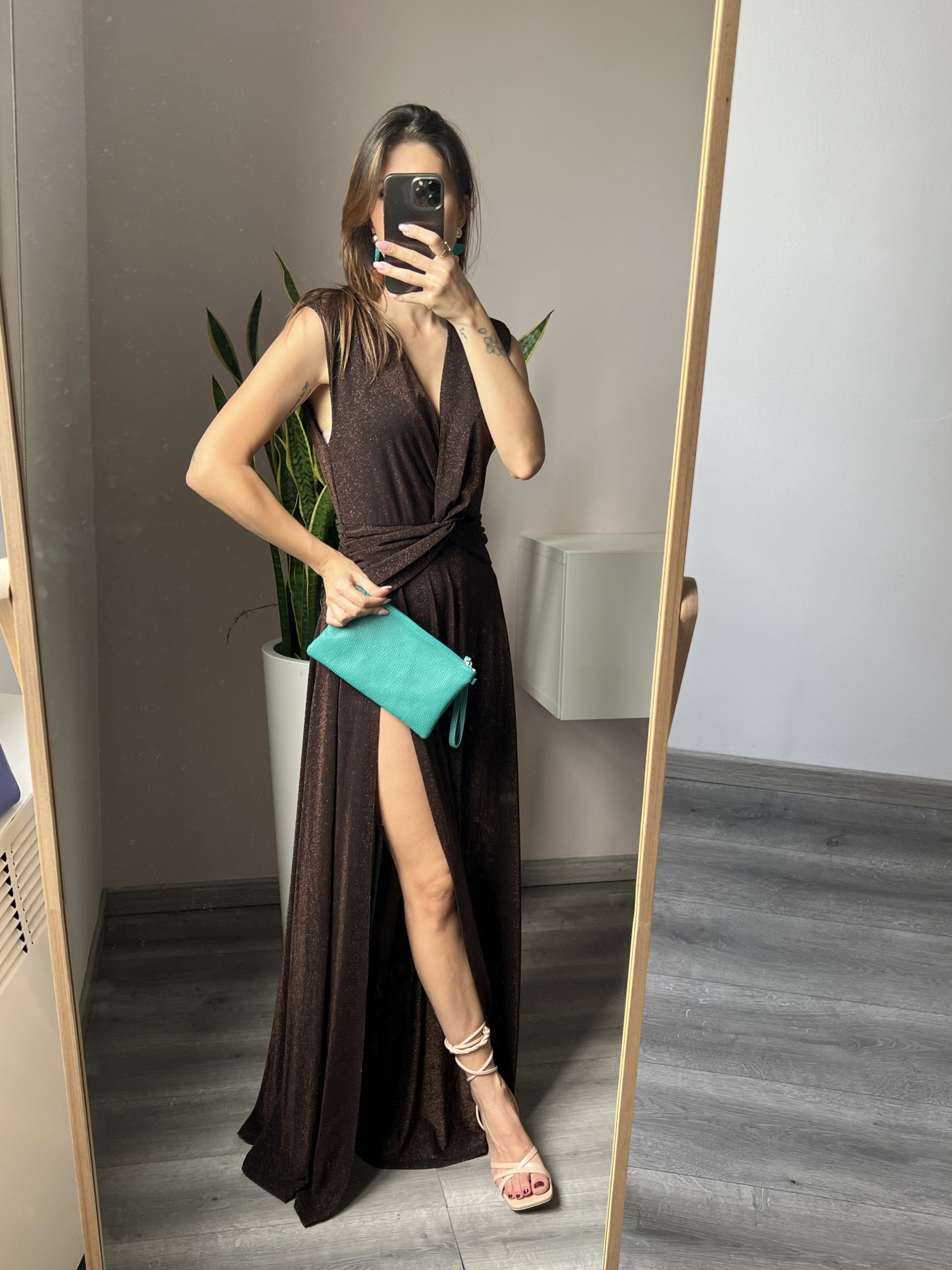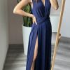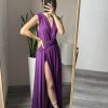 Abito con scollo a V incrociato caratterizza da fascia annodata sulla vita.