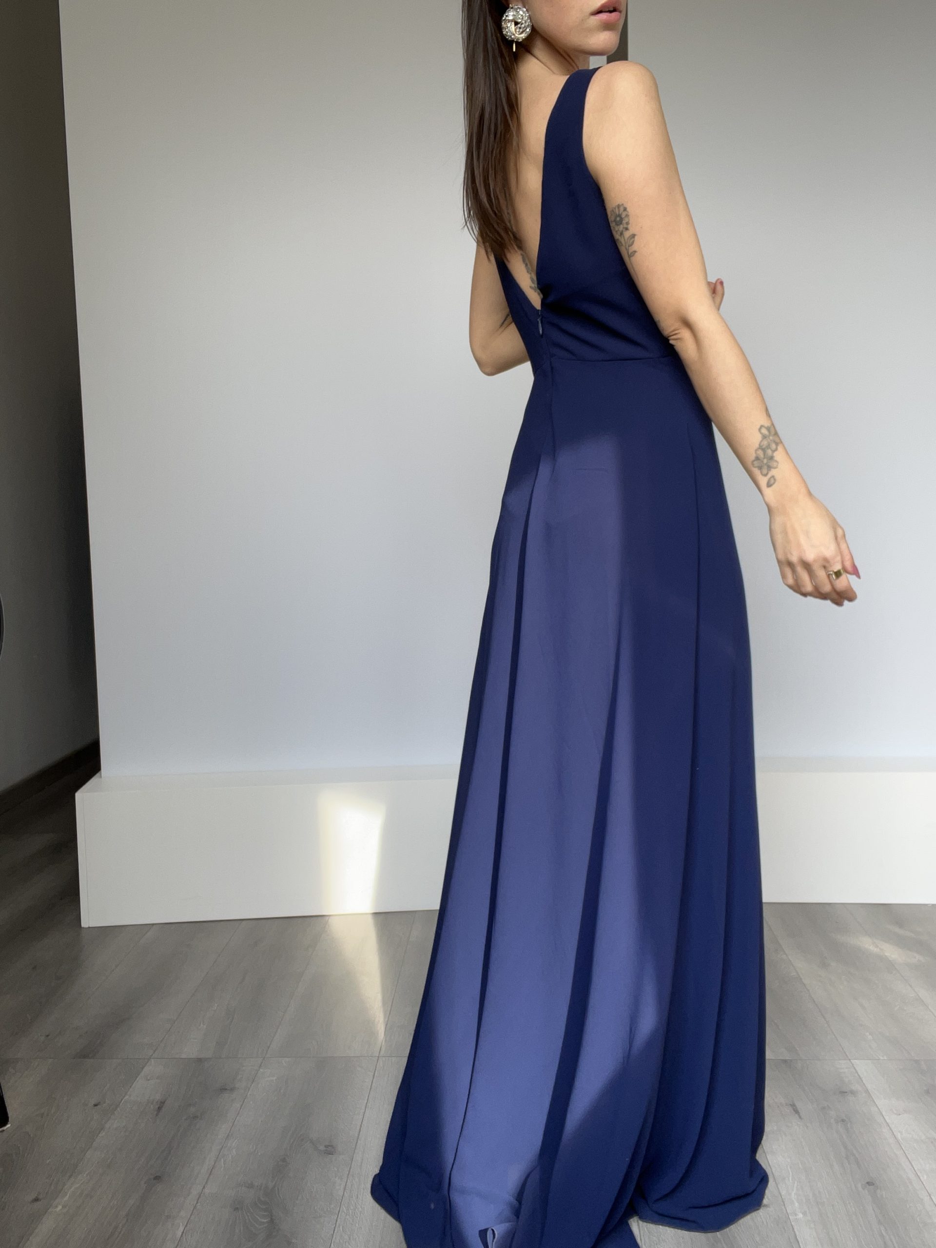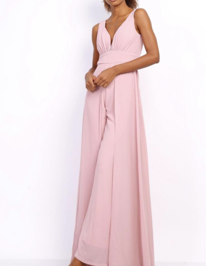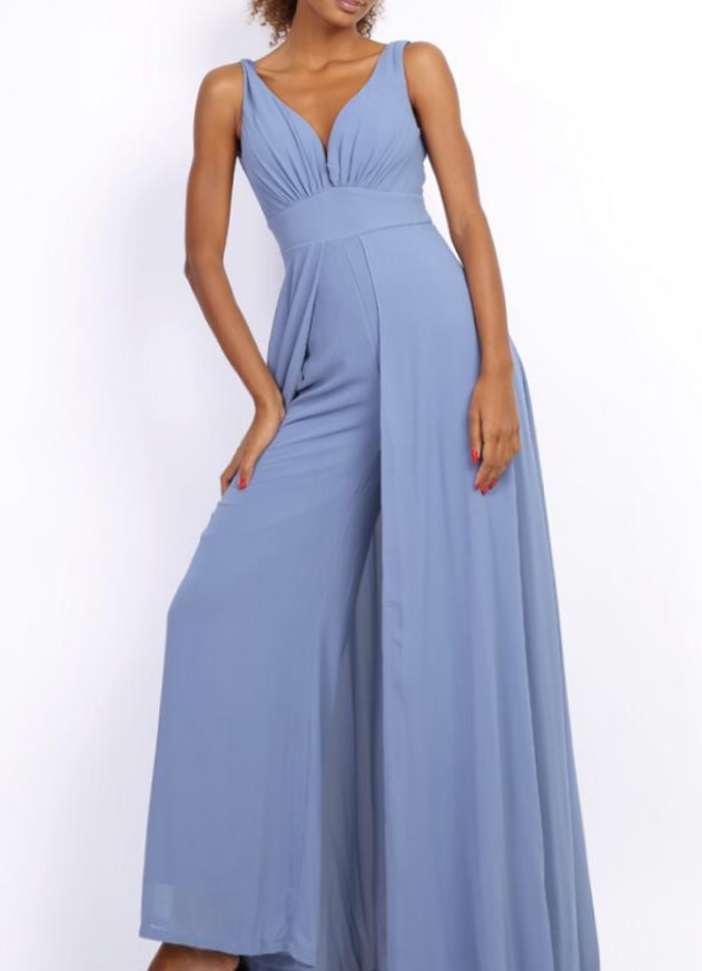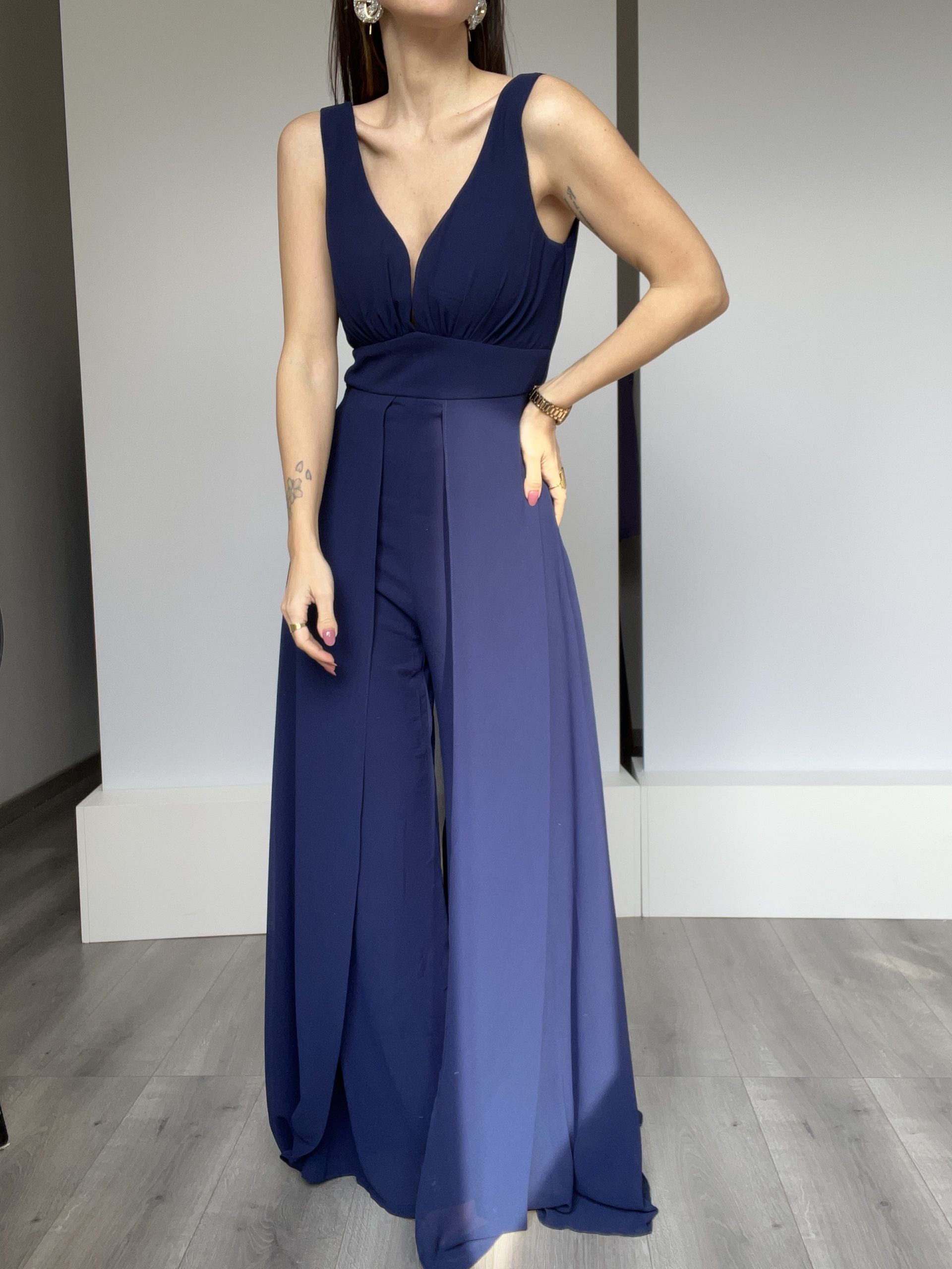 Abito con scollo a V con coppe preformate con pantalone a zampa con strascico sulla parte finale.