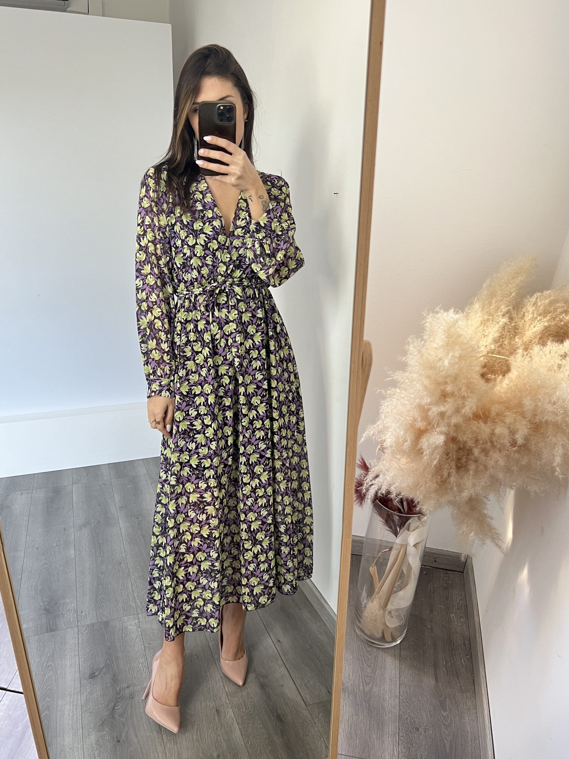 Abito elasticizzato con scollo incrociato foderato centralmente e cinturino sul punto vita