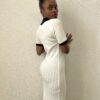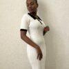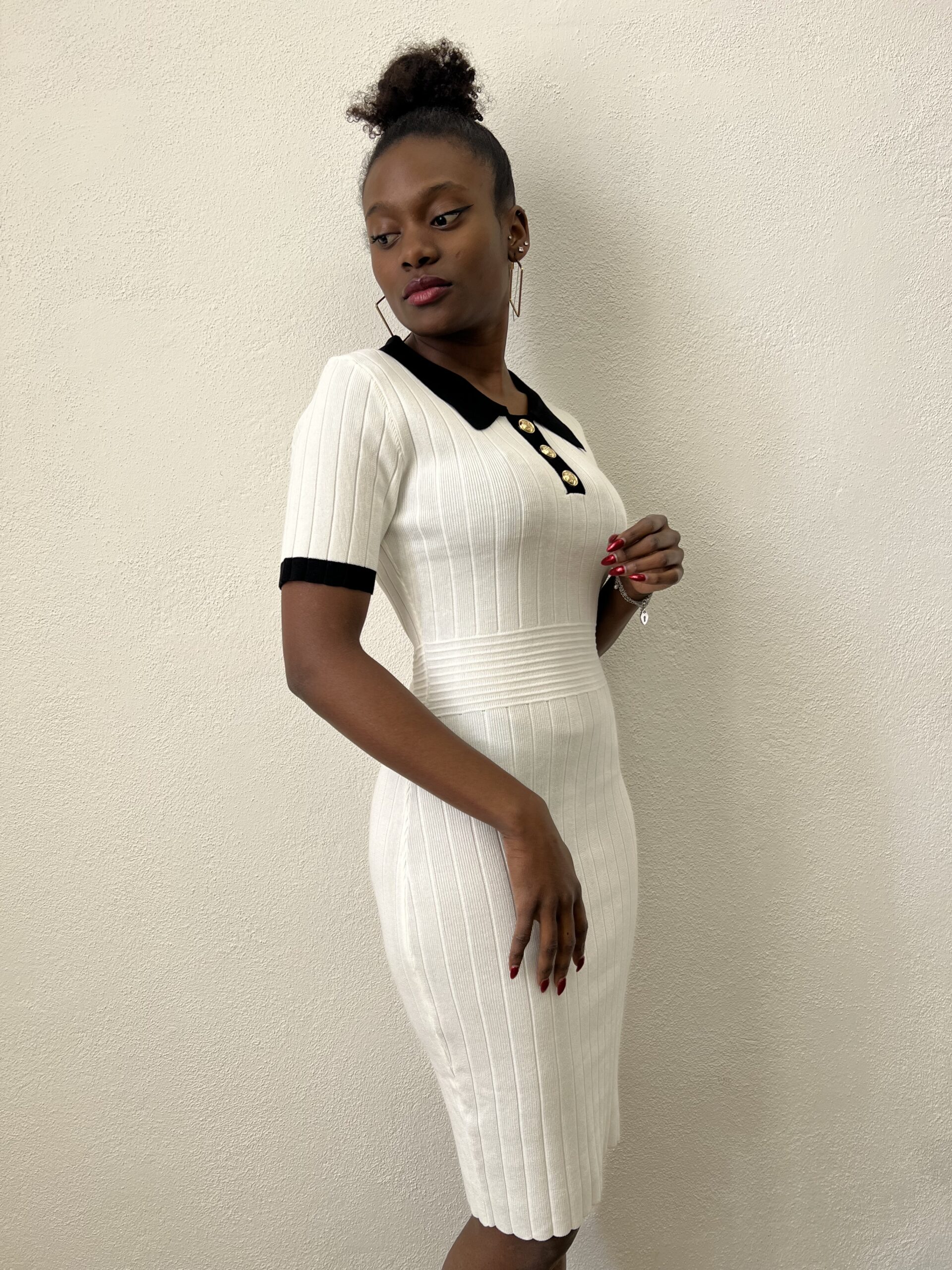 Abito a costine a manica corta con colletto bianco e bottoni goffrati in oro.