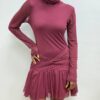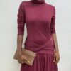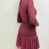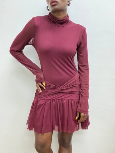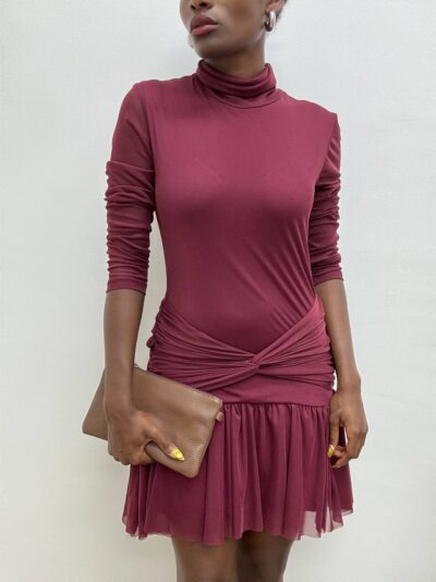 L’abito è realizzato in tulle bordeaux dalla linea sofisticata e femminile, pensato per esaltare la figura con grazia e discrezione. Il dettaglio protagonista è l’intreccio strategico sulla parte frontale bassa, studiato per creare un delicato drappeggio che minimizza visivamente l’addome pronunciato, donando equilibrio e armonia alla silhouette.