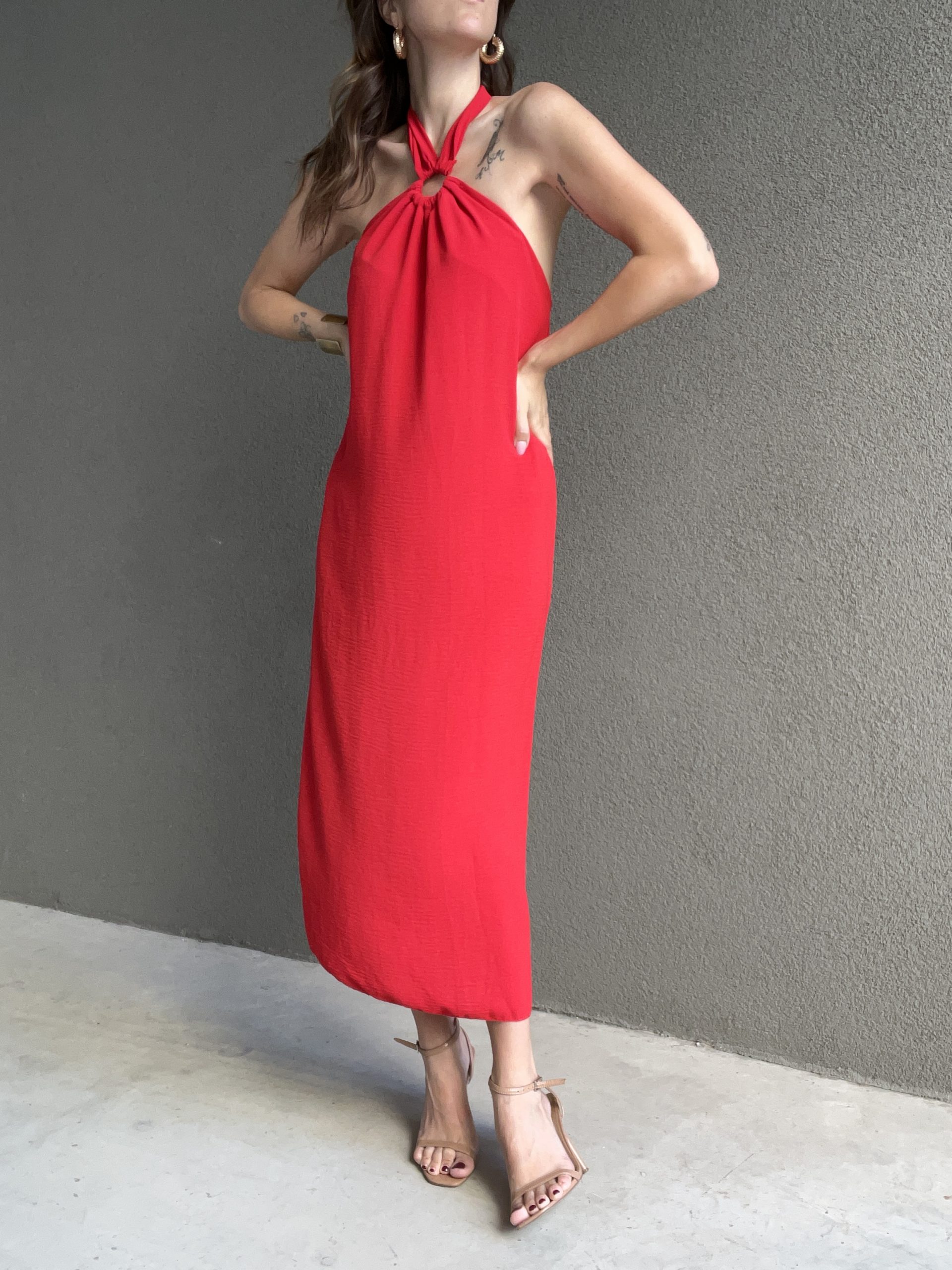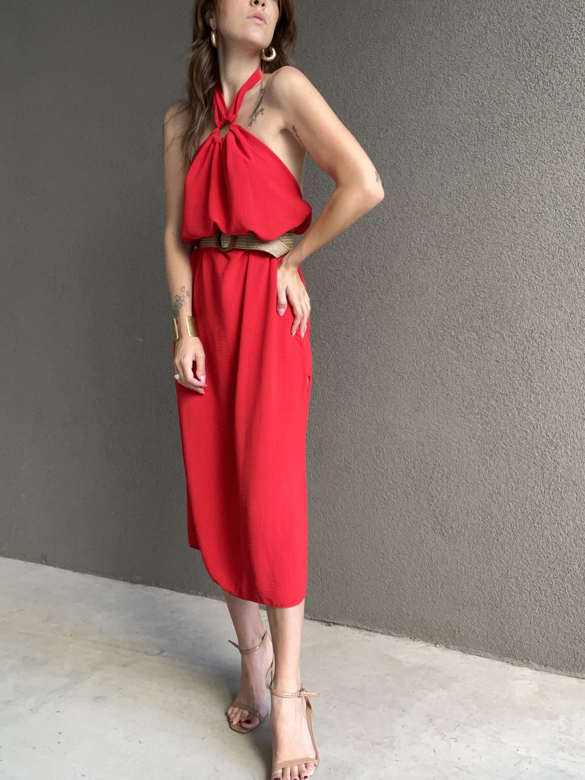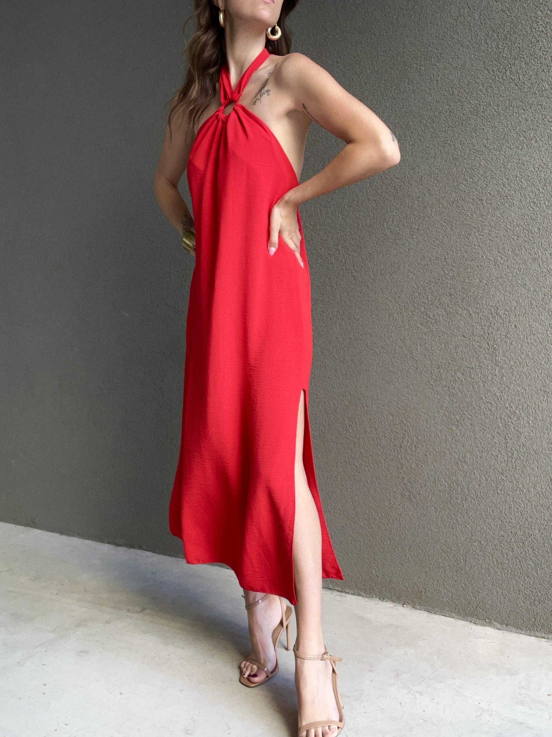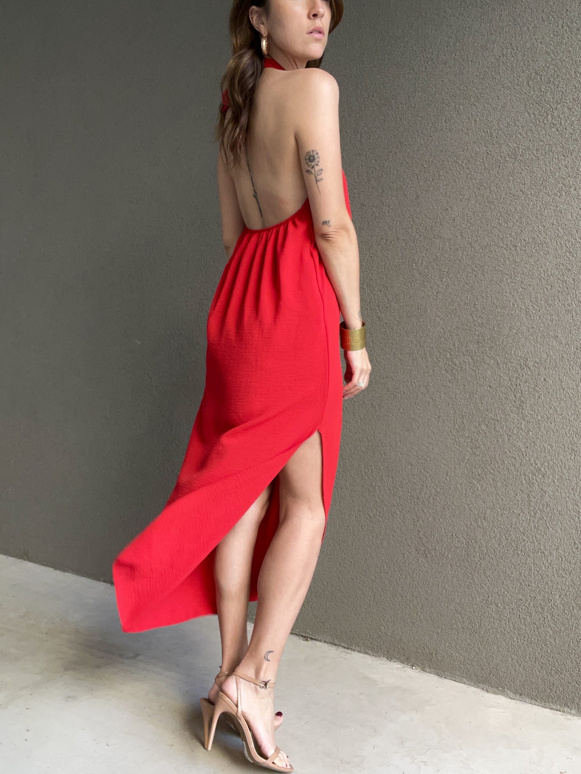 Abito lungo con spacchi laterali. Chiusura con lembi chiusi sul collo. Vestibilita morbida.