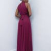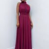 Abito lungo con collo leggermente alto con chiusura posteriore di due bottoni. Foderato internamente.