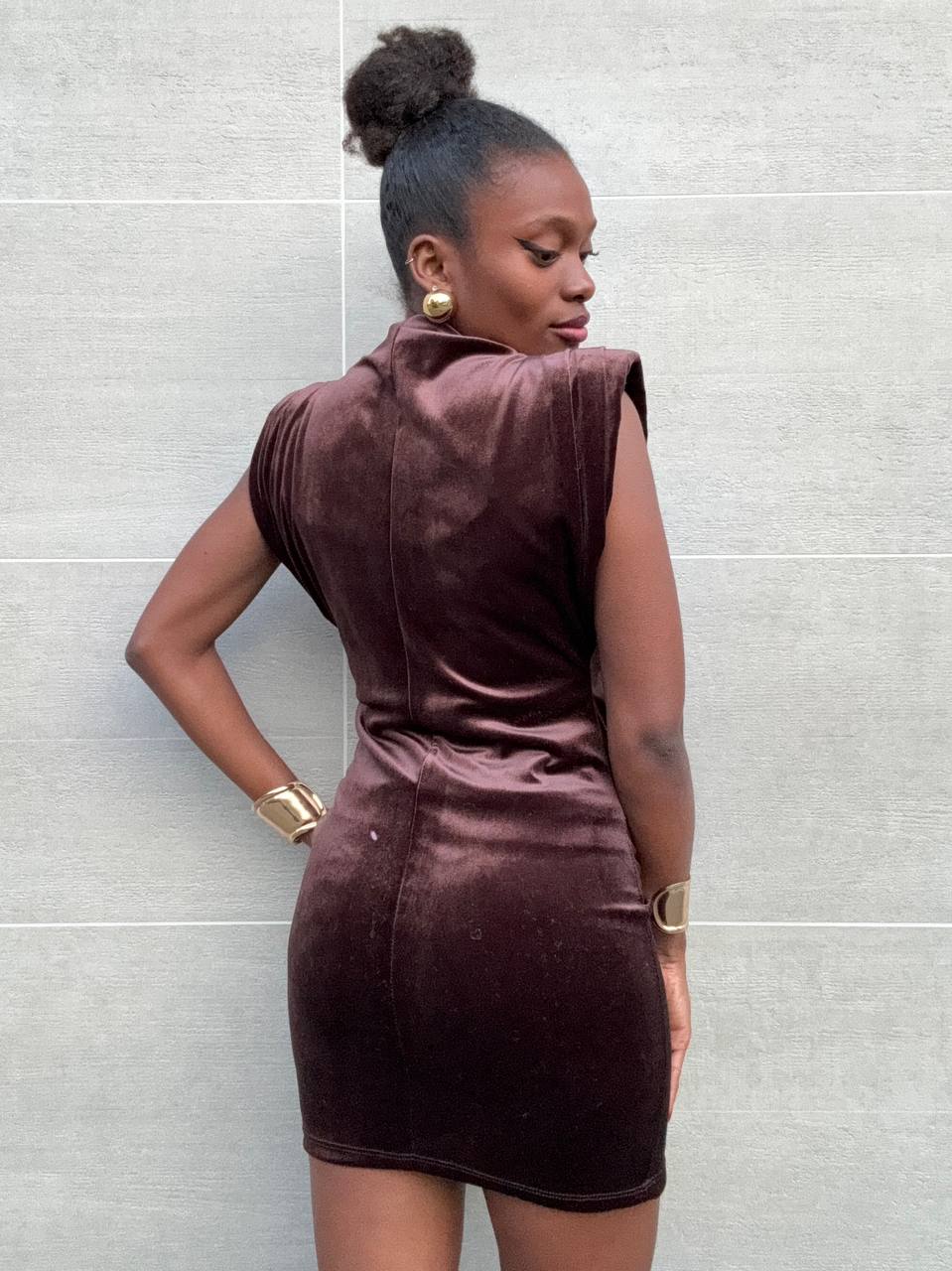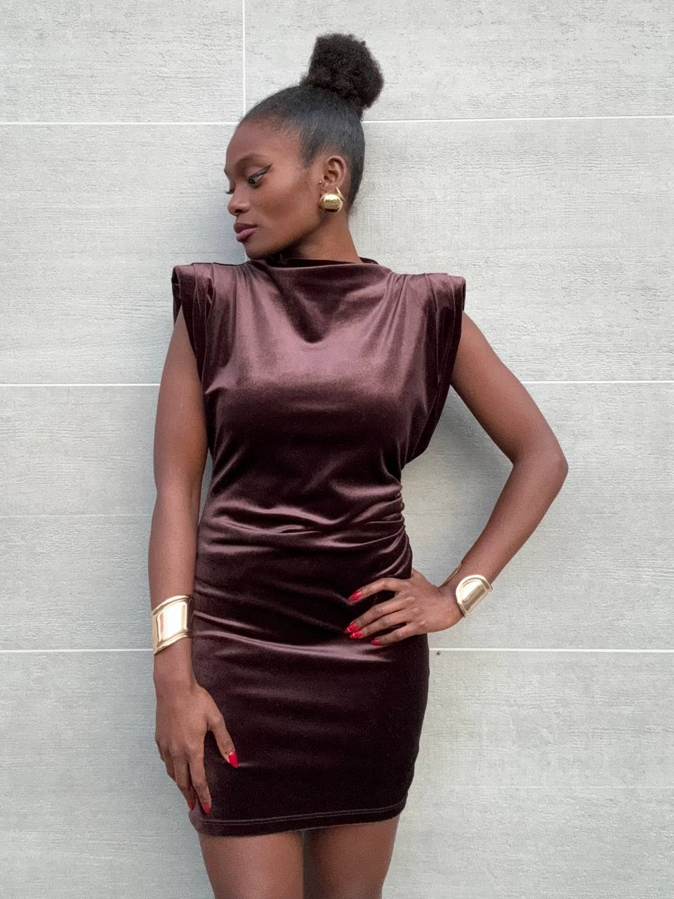 Abito in velluto smanicato con spalline imbottite a tinta unita con dettaglio di mini drappeggio laterale. Elasticizzato.