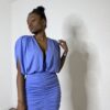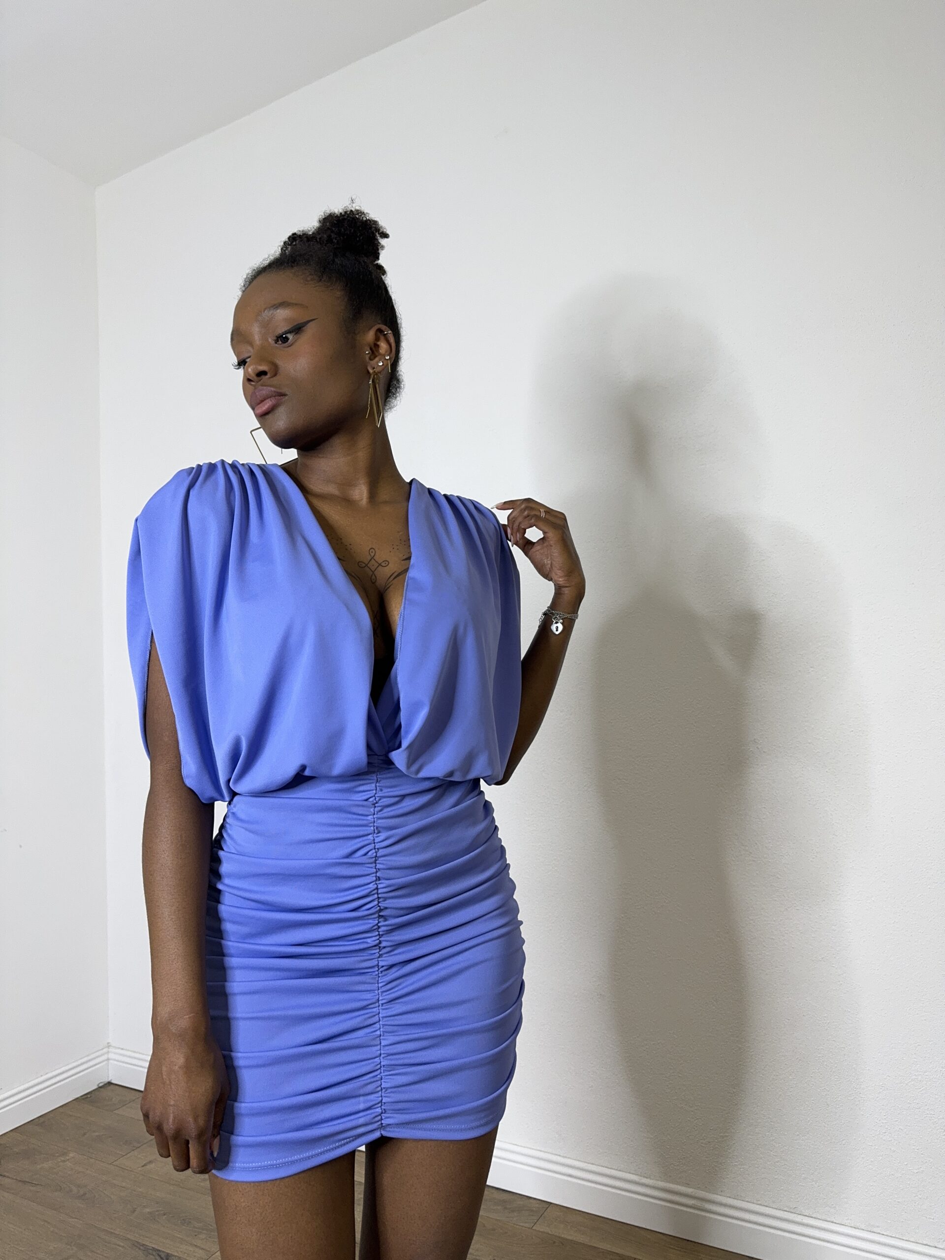 Abito elasticizzato smanicato drappeggiato su tutta la lunghezza a tinta unita.