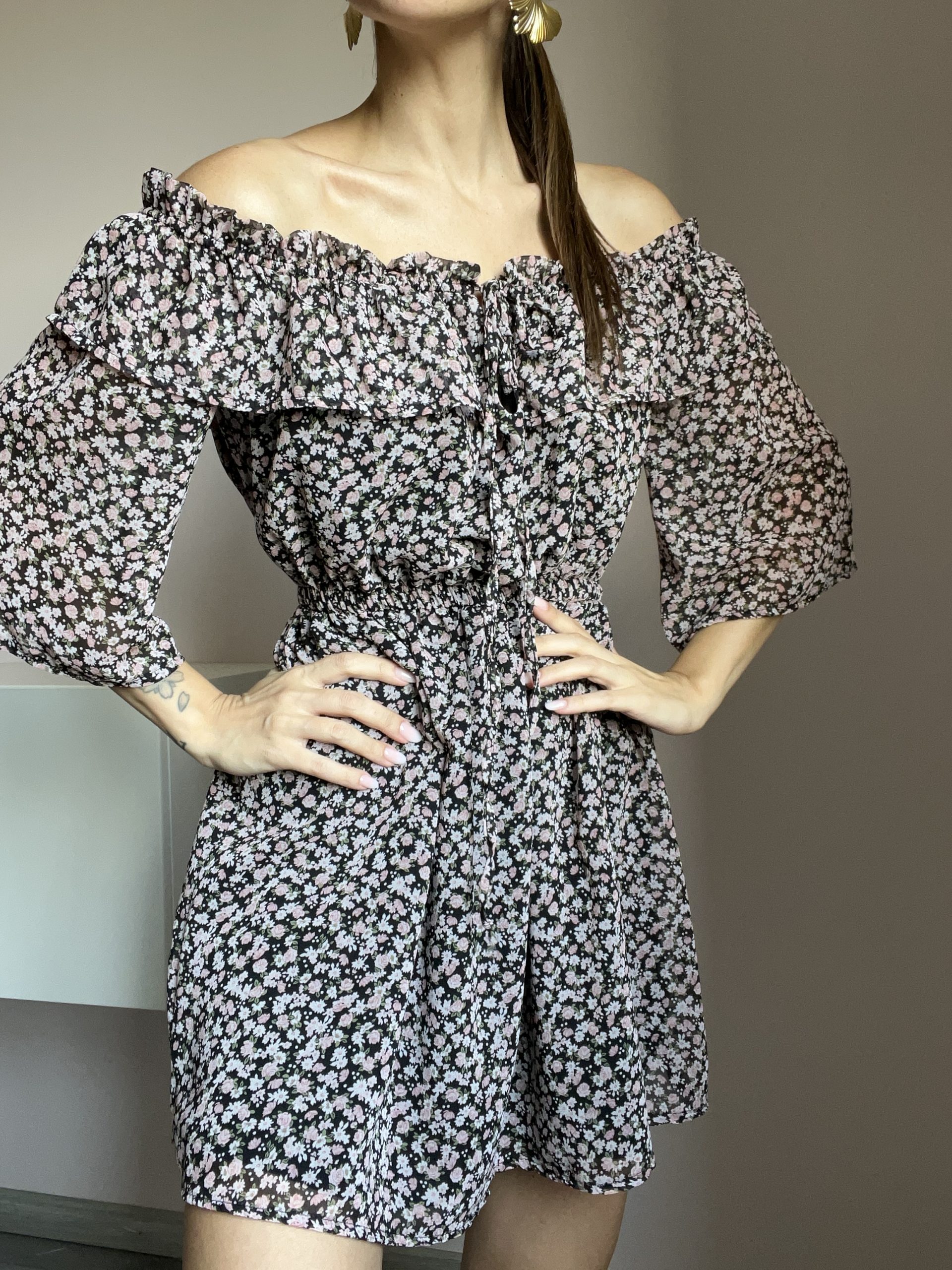 Abitocon elastico in vita e balza elasticizzata sulla parte superiore. Manica a campana. Fodera centrale.