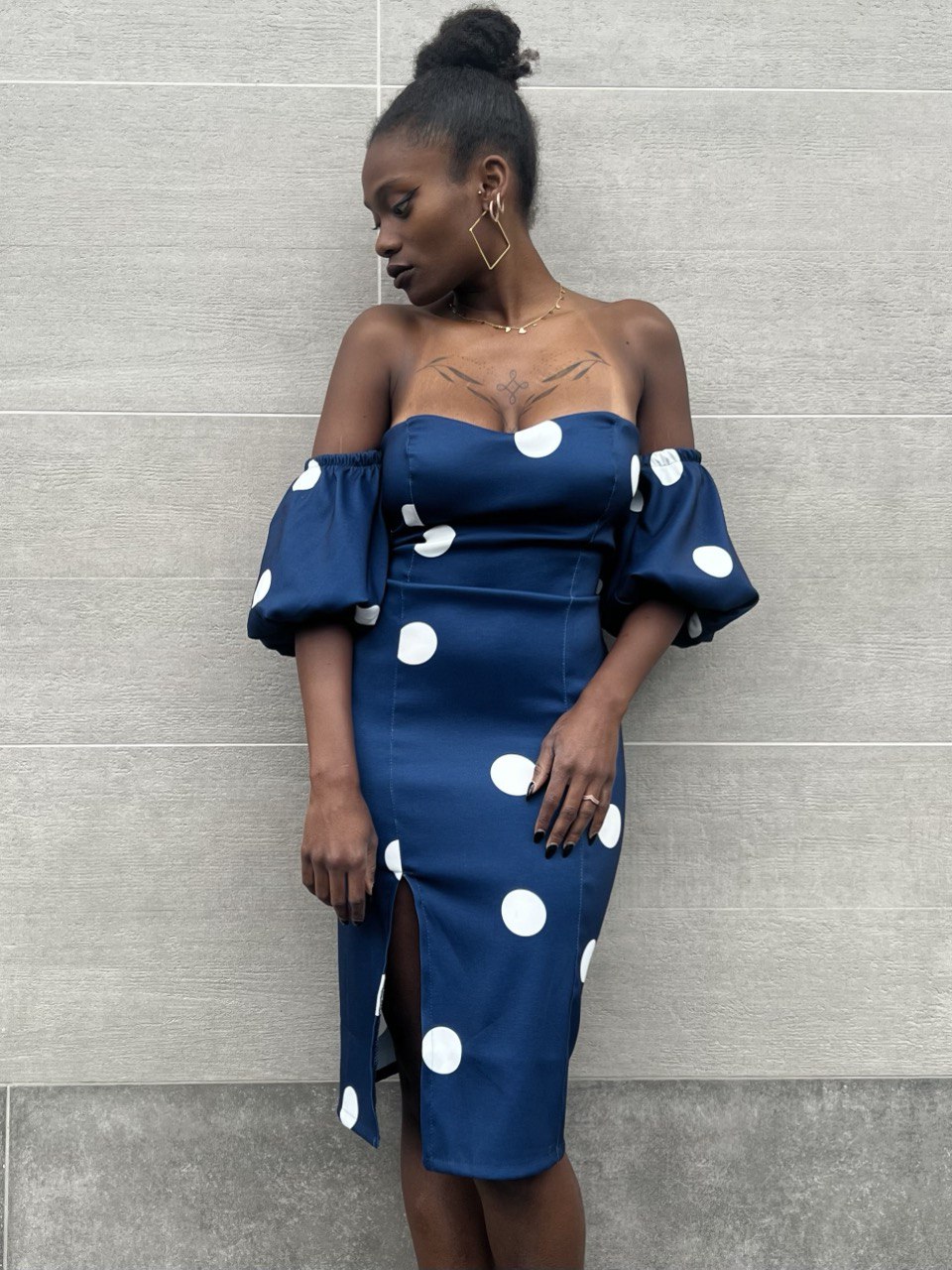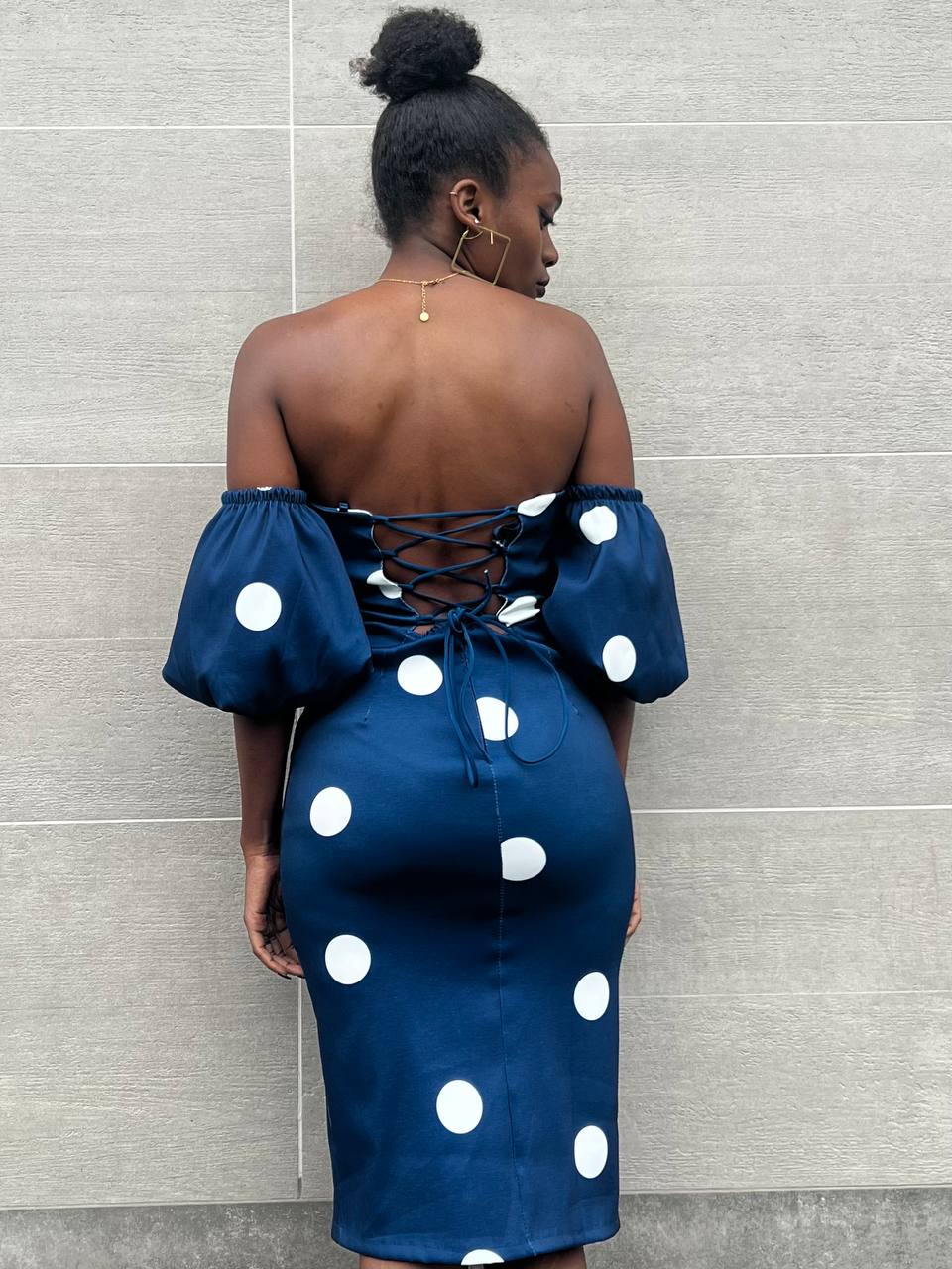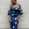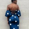 Abito con coppe preformate con pois nero su tutta la lunghezza. Elasticizzato. Chiusura posteriore con cerniera e laccio.