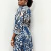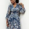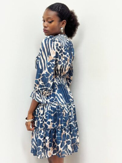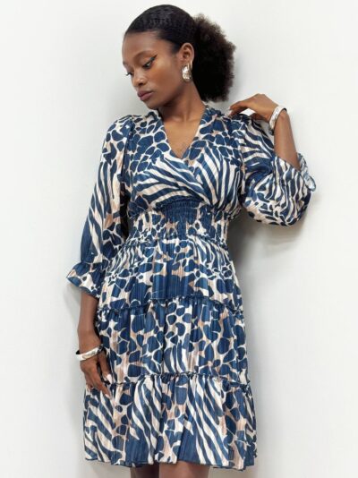 Abito corto con scollo a V con fantasia animalier a maniche lunghe e semitrasparenti con elastico ai polsi con fascia arricciata in vita.