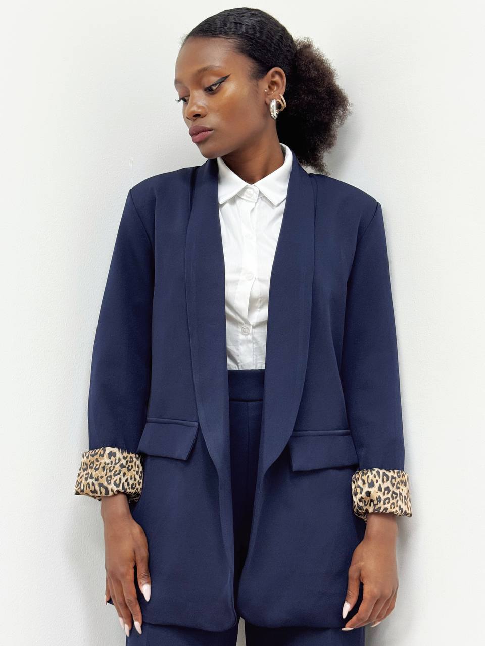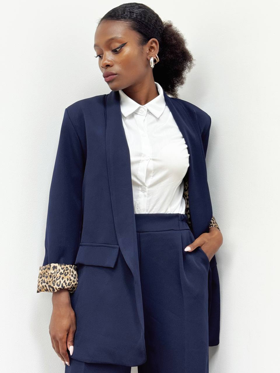Blazer  con collo a V con spalline imbottite con taglio ampio e vestibilità oversize con fodera interna con stampa leopardata anche sui polsini.