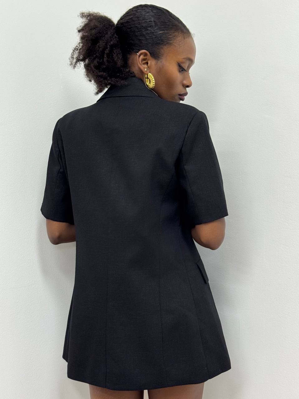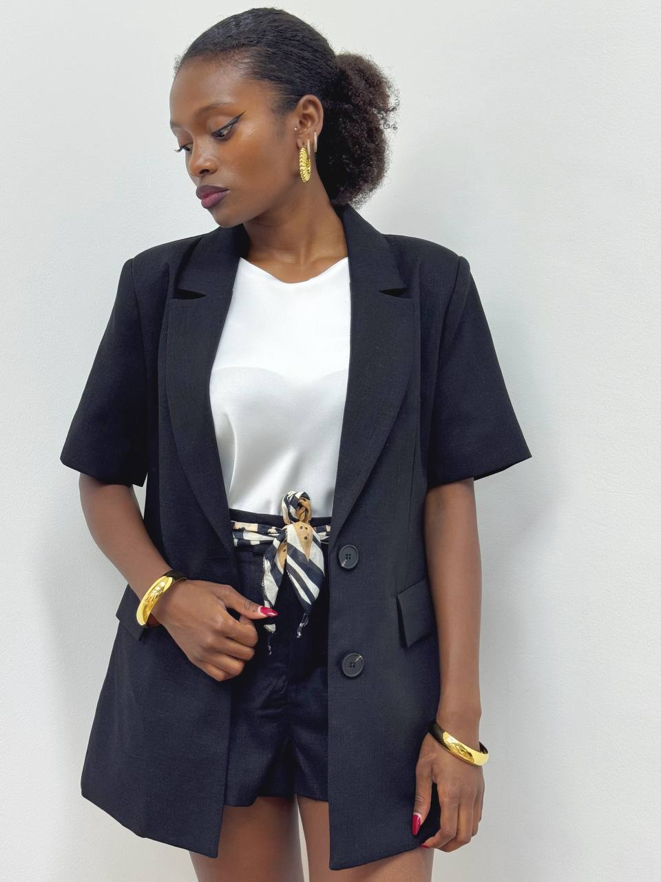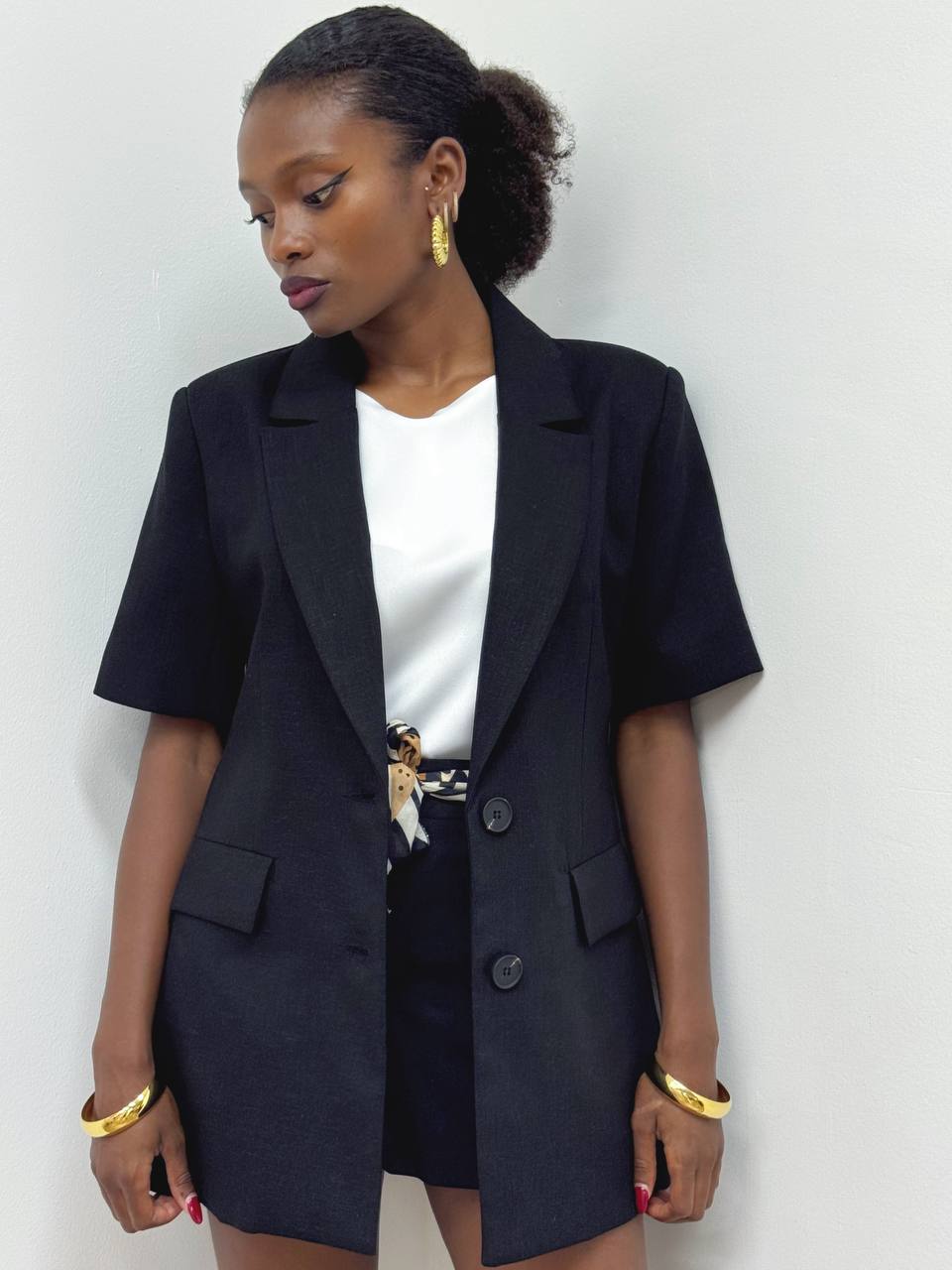 Blazer con colletto a lancio  a manica corta con spallina insellata a tinta unita con chiusura di due bottoni con taschine cucite a filo.