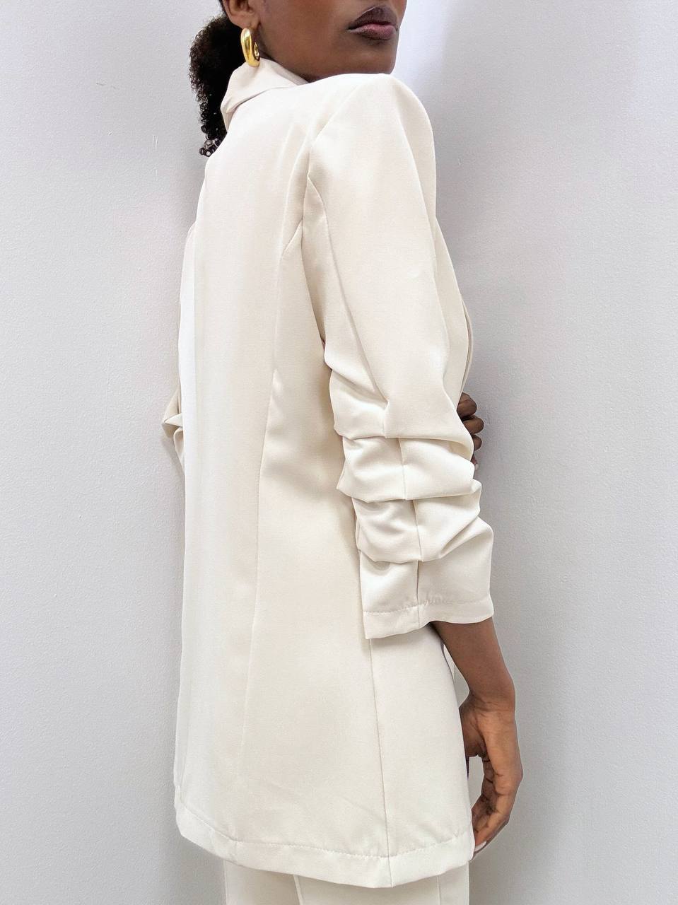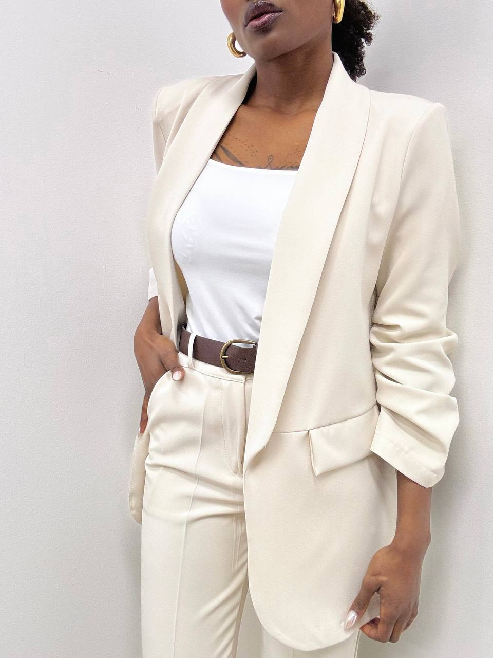 Versatile, comoda, elegante: questa giacca è la base ideale per creare un completo perfetto da indossare H24, 7 giorni su 7. Un capo pensato per accompagnarti in ogni momento della giornata, dall’ufficio all’aperitivo, senza rinunciare a stile e praticità. Realizzata in un tessuto fluido e compatto, ha un taglio morbido e strutturato allo stesso tempo, con spalline leggermente rinforzate che donano forma e portamento, senza appesantire la silhouette. La manica arricciata aggiunge un dettaglio femminile e moderno, mentre le patte laterali richiamano un design sartoriale essenziale ma curato. La giacca è taglia unica, studiata per vestire comodamente dalla taglia 40 alla 44/46, adattandosi con armonia a diverse fisicità. Per un look completo e impeccabile, abbinala al suo pantalone coordinato dal taglio sigaretta: un set elegante, funzionale e sempre attuale, perfetto per ogni occasione che sia una giornata di lavoro, un evento speciale o una semplice uscita quotidiana. Un capo che unisce stile, comfort e versatilità: il tuo alleato perfetto, sempre.