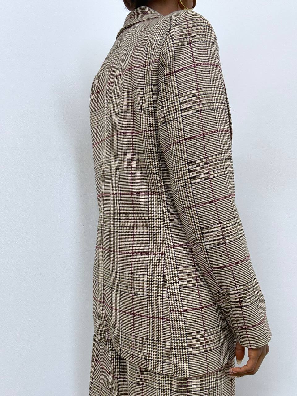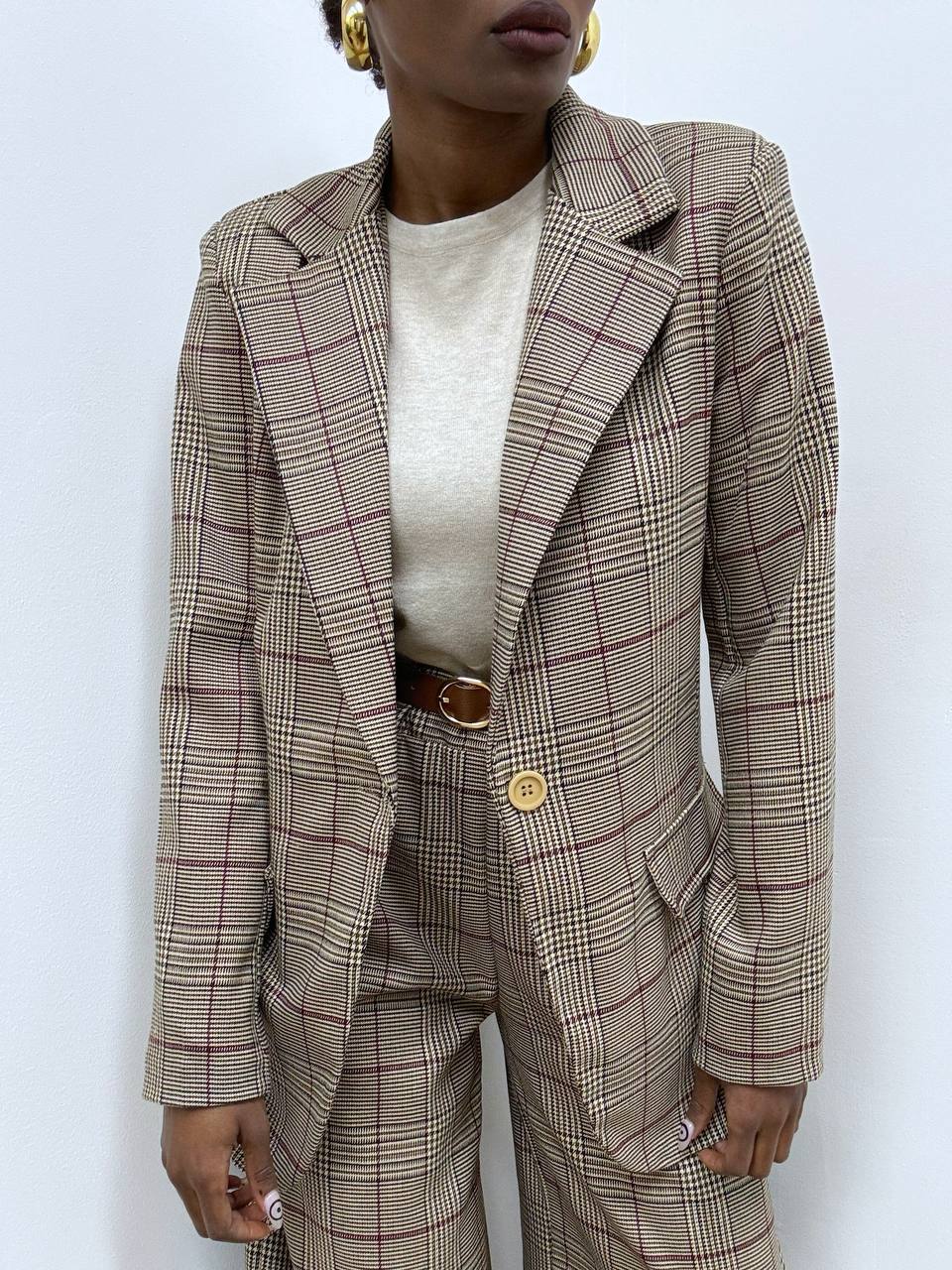 Blazer monobottone dalla linea strutturata e moderna, caratterizzato da una raffinata stampa check che aggiunge personalità e stile al capo. Le spalline insellate valorizzano la silhouette, conferendo un’eleganza definita senza risultare rigide. Foderato internamente, garantisce comfort e vestibilità impeccabile. Il design è completato da due finte taschine centrali, che offrono un dettaglio sartoriale discreto e sofisticato. Perfetto per look formali o abbinamenti contemporanei dal gusto ricercato.