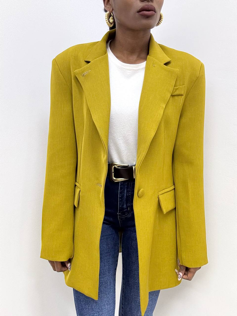 Blazer dal taglio contemporaneo con spallina insellata, studiato per valorizzare la silhouette senza rinunciare al comfort. La fodera interna conferisce una vestibilità morbida e una sensazione piacevole al tatto, mentre il dettaglio del bottone di chiusura aggiunge un tocco sofisticato e discreto. Il davanti è arricchito da due finte taschine, che mantengono la linea pulita e minimale del capo, rendendolo perfetto per look eleganti, da ufficio o occasioni formali.