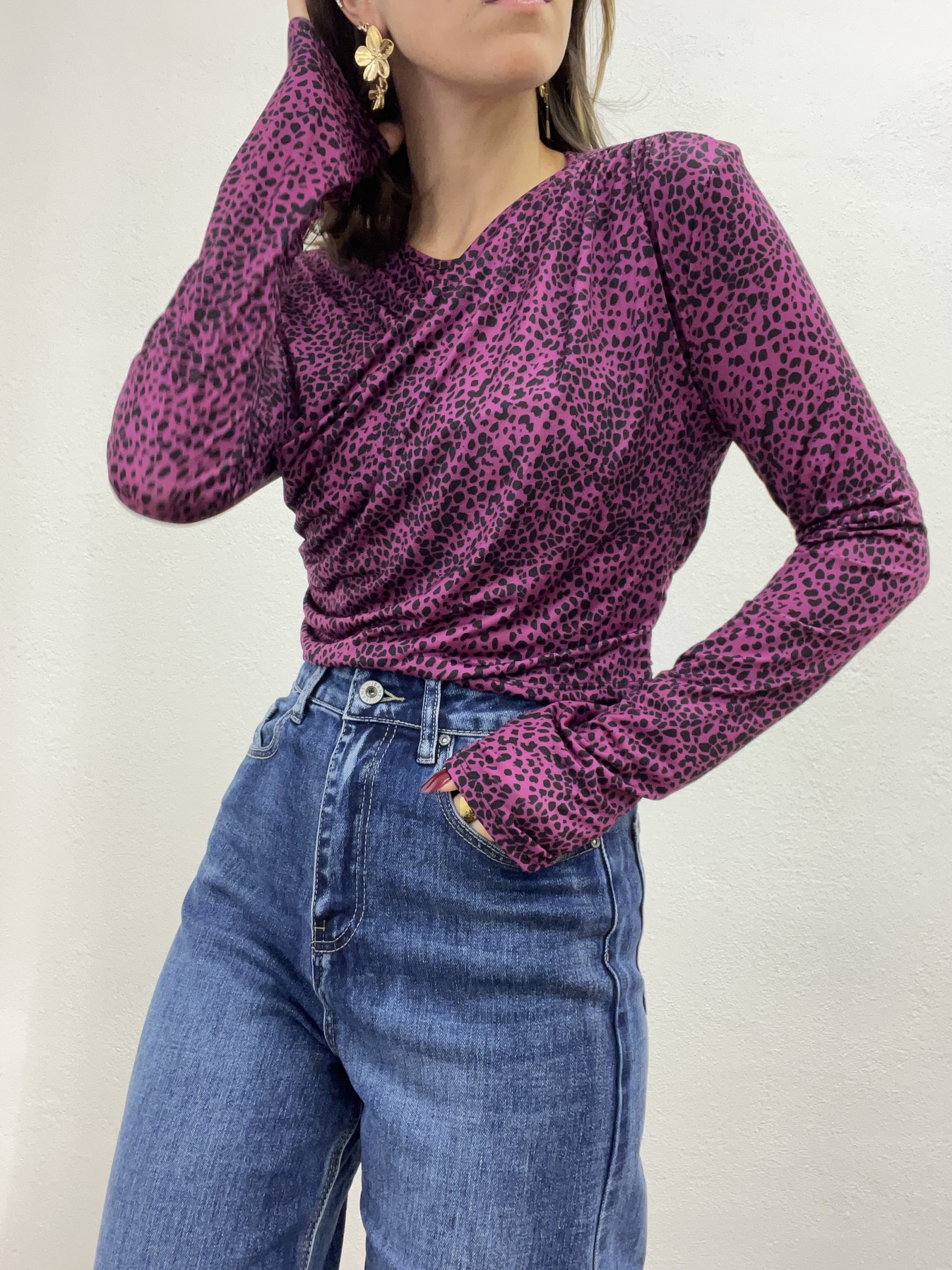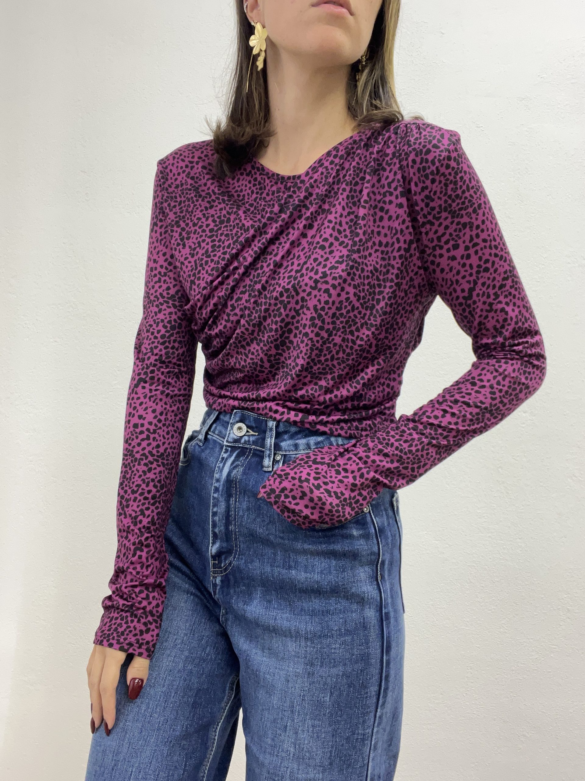 Blusa elasticizzata e drappeggiata su tutta la lunghezza con stampa.