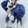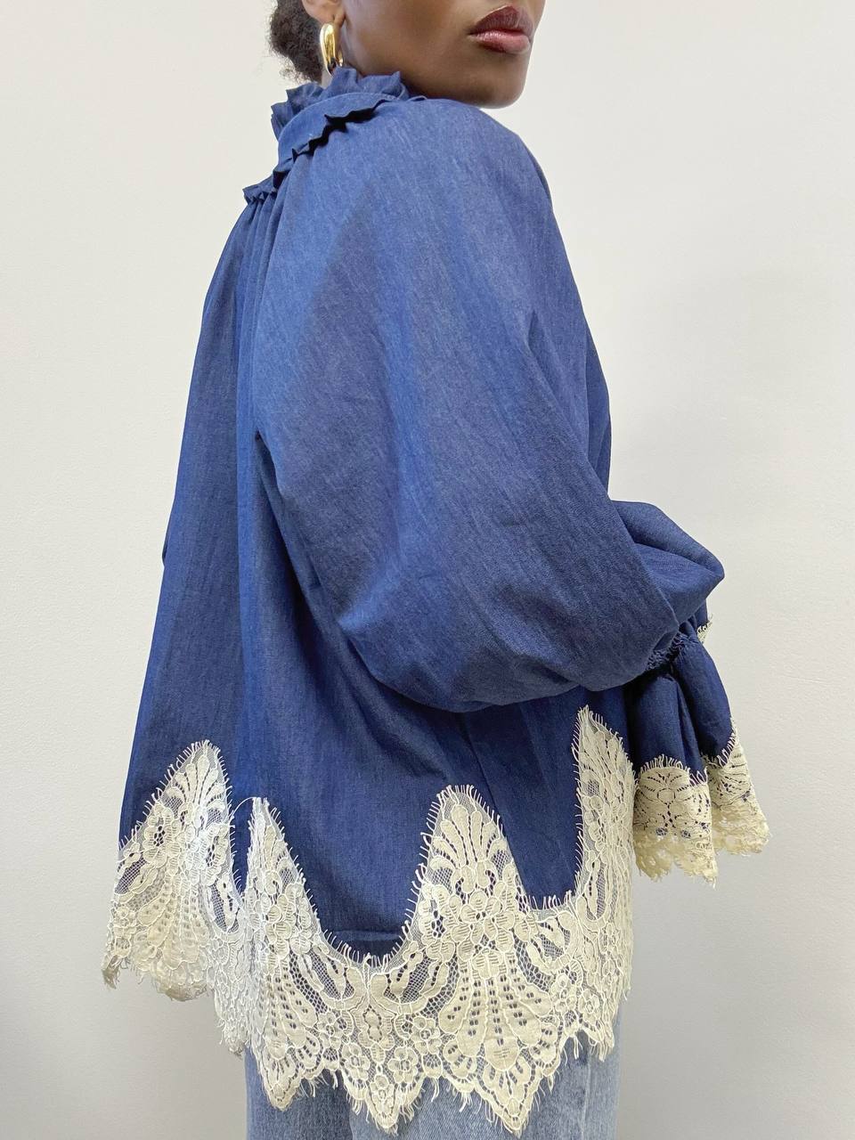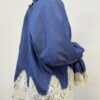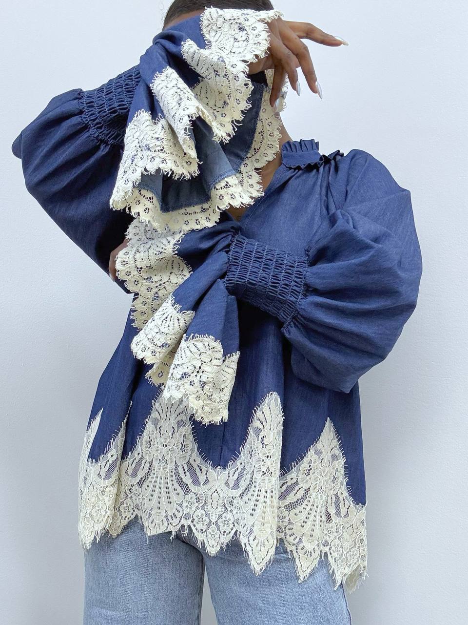 La parte finale del capo è impreziosita da inserti in pizzo, che donano trasparenze sofisticate e un’allure ricercata. Le maniche a campana, ampie e fluide, sono arricchite da un dettaglio elasticizzato che assicura comfort e una vestibilità armoniosa, completate da finiture in pizzo che richiamano il motivo del fondo.