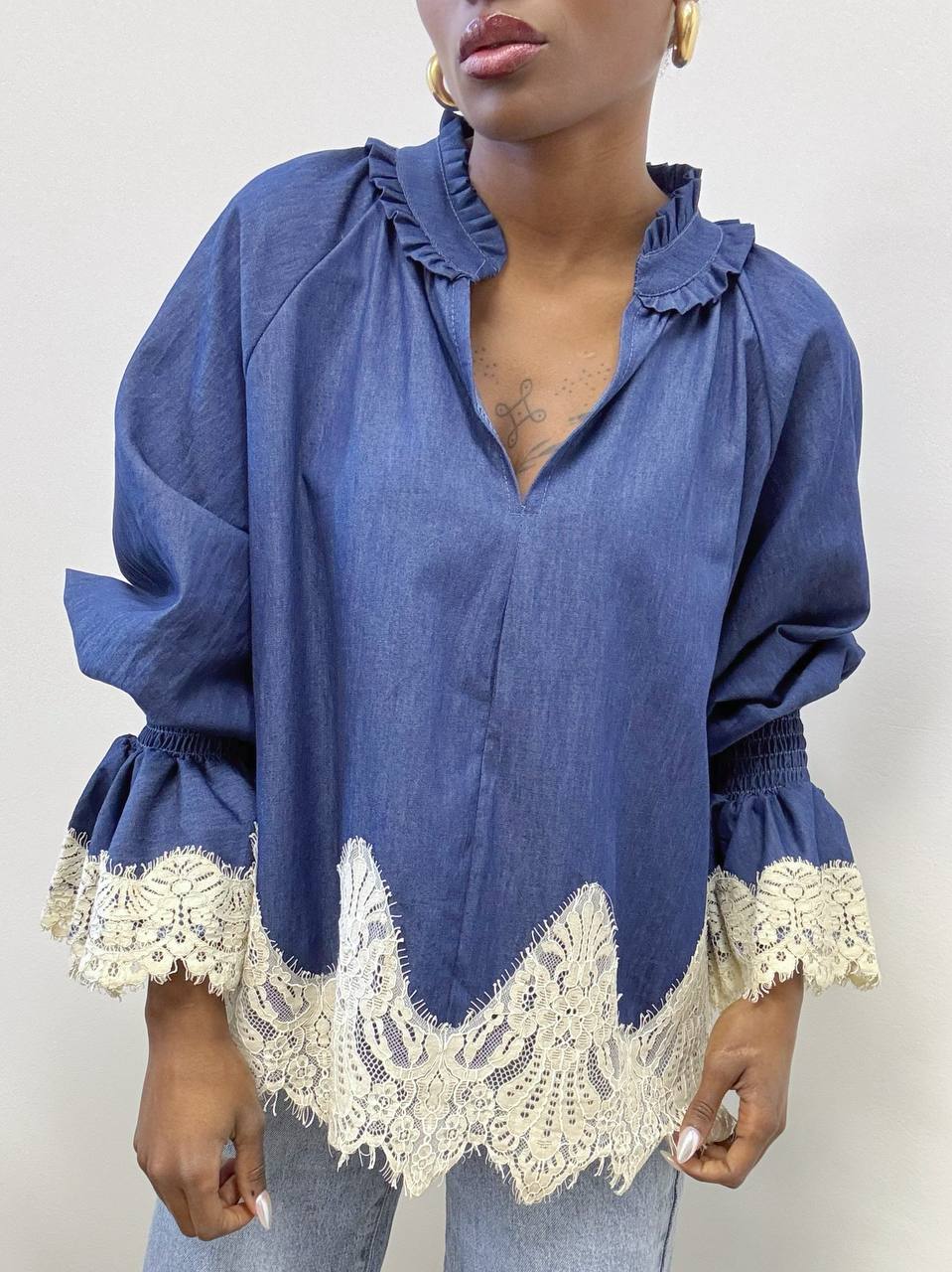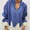 Blusa dal gusto romantico e raffinato, perfetta per aggiungere un tocco femminile a qualsiasi look. Il design presenta uno scollo a V valorizzato da un delicato colletto con volant sulla parte alta, che incornicia il décolleté con eleganza e leggerezza.