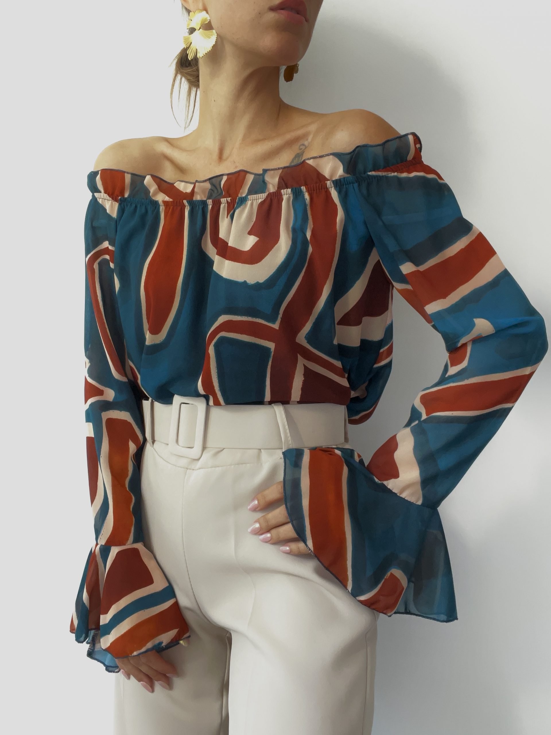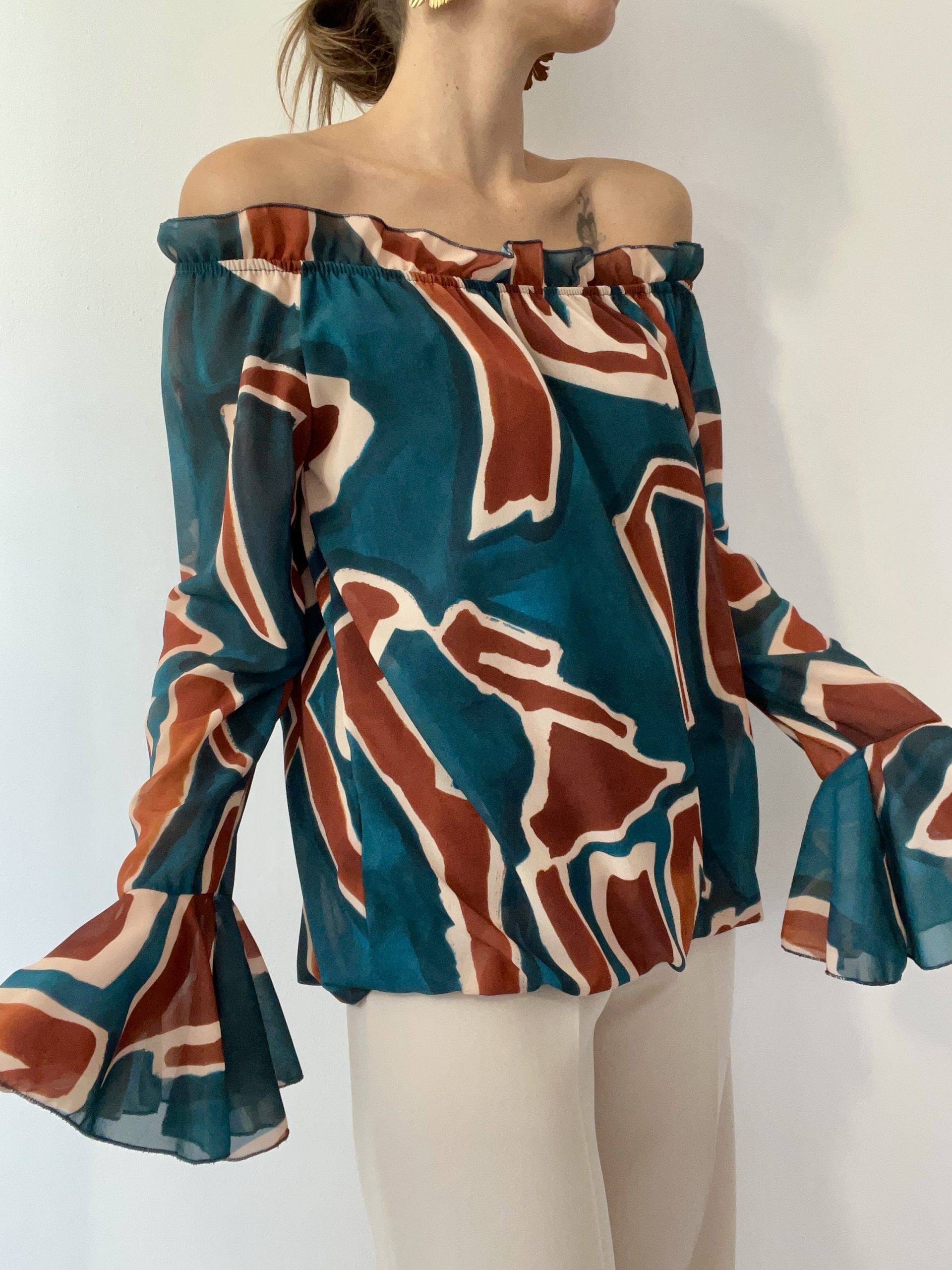Blusa con scollo off shoulder made in Italy con fondo elasticizzato e polsino a campana.