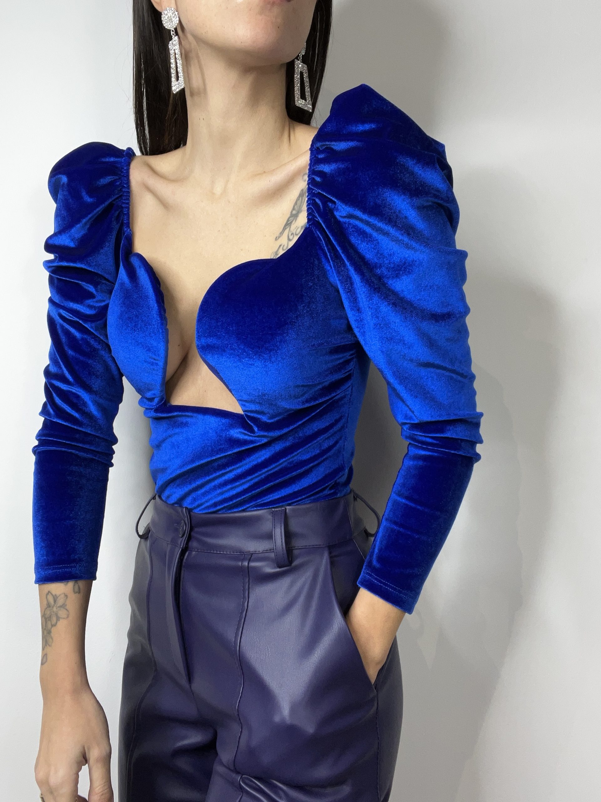 Body in velluto con scollo a cuore con coppe preformate con ferretto( possibilità di toglierle) con spallina elasticizzata.