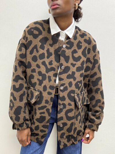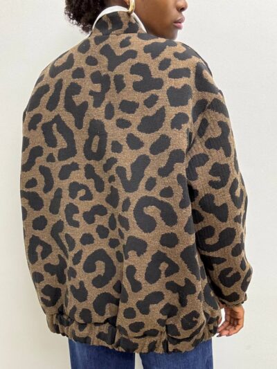 Un bomber contemporaneo e grintoso in misto cotone, caratterizzato da un sofisticato motivo animalier color cioccolato e nero. Il taglio è leggermente sfiancato per valorizzare la silhouette pur mantenendo il comfort tipico del capo. La chiusura è centrale con sei bottoni di chiusura interna disposti in fila per un effetto grafico e minimalista. Due tasche frontali centrali offrono praticità e un’estetica pulita; i polsini elasticizzati sul fondo manica garantiscono vestibilità aderente, isolamento e libertà di movimento. Rifinito internamente con cuciture curate e collo basso a giro, questo bomber è perfetto per completare look casual-chic o per dare carattere a outfit sobri.