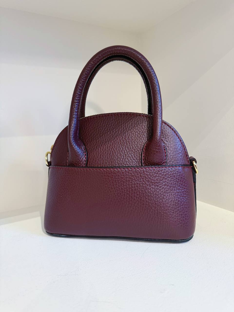 Borsa a mano più tracolla in vera pelle a tinta unita con cerniera interna e tasche laterali.