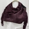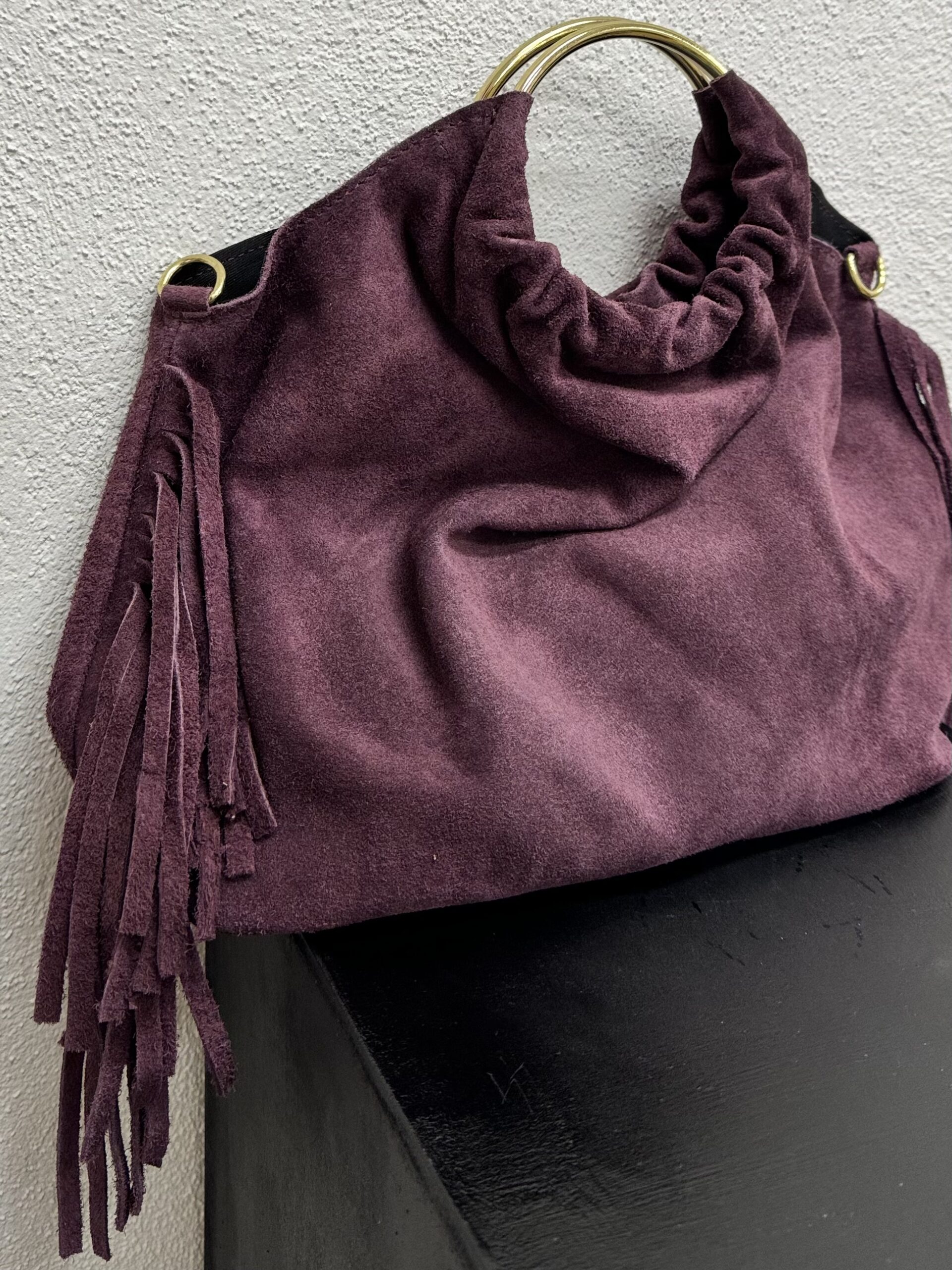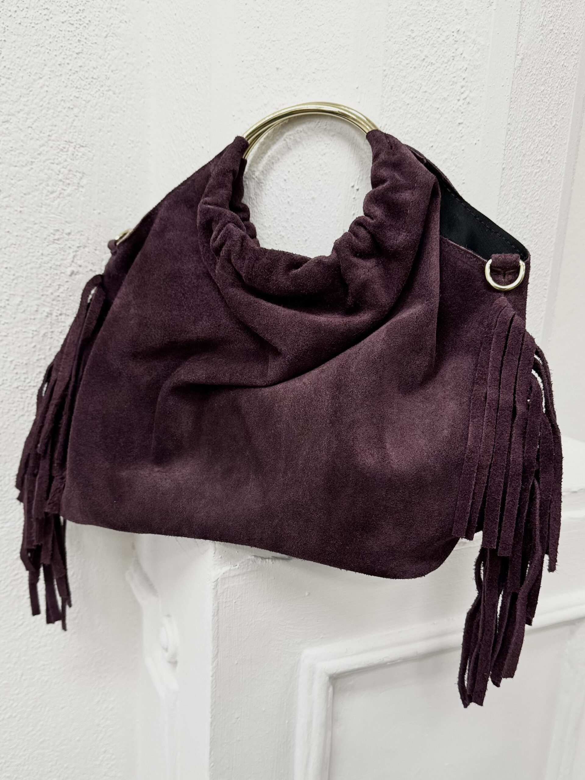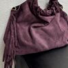 Borsa in camoscio con frange a tinta unita. Chiusura con bottone a clip. Manico a forma circolare. Possibilità di metterla a tracolla.
