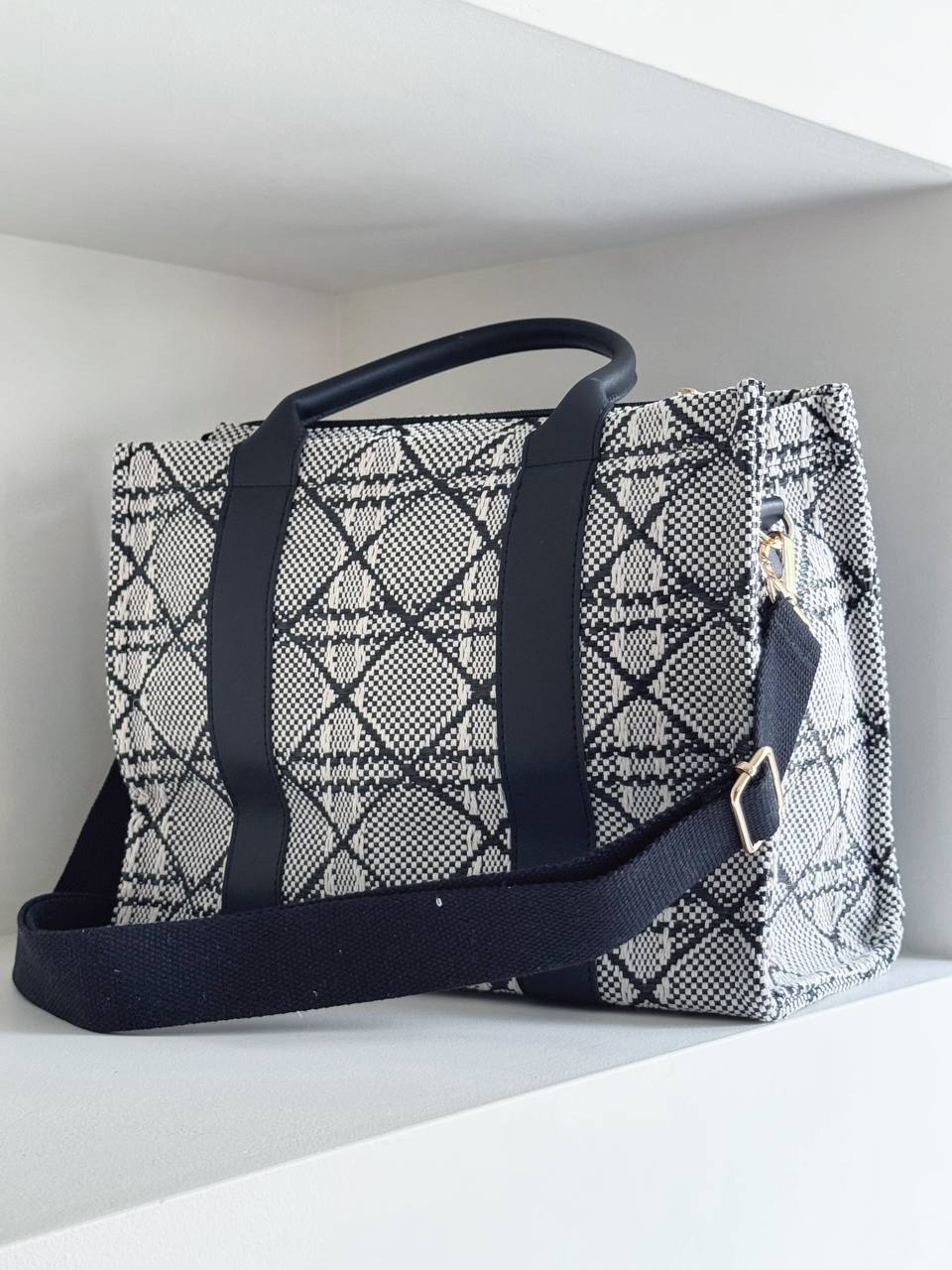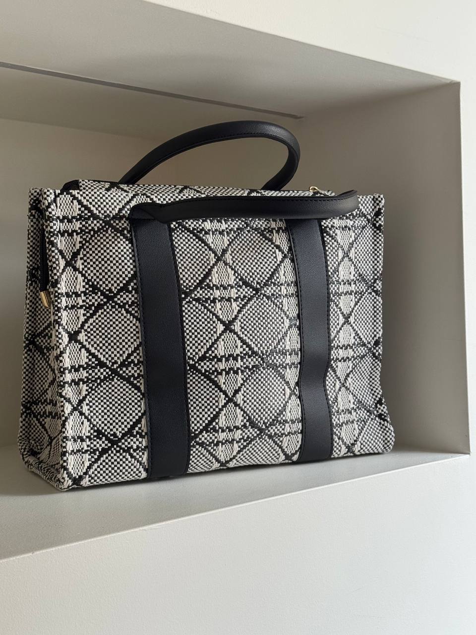 Borsa con stampa a scacchi con manici foderati con taschine interne. Tracolla interna.