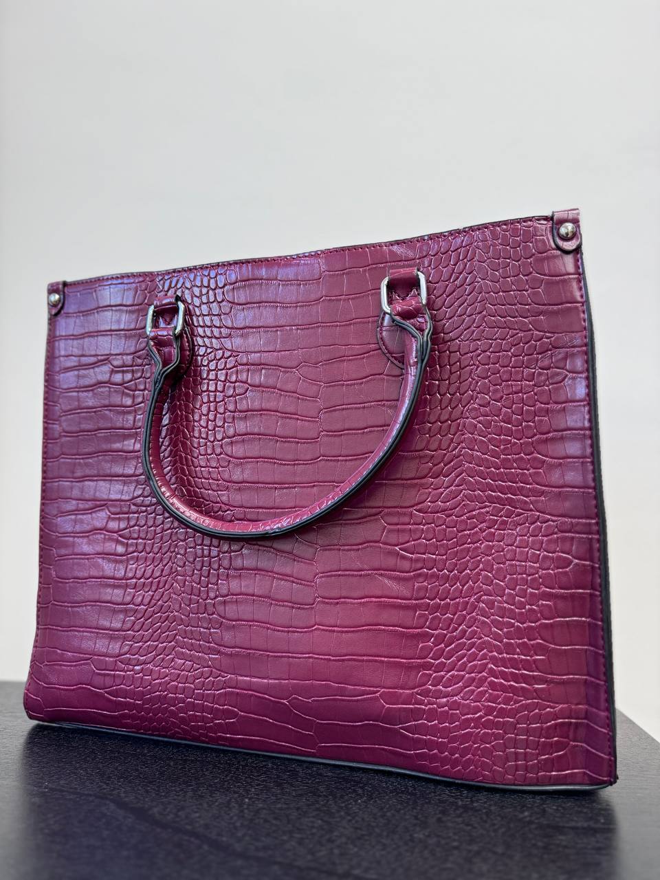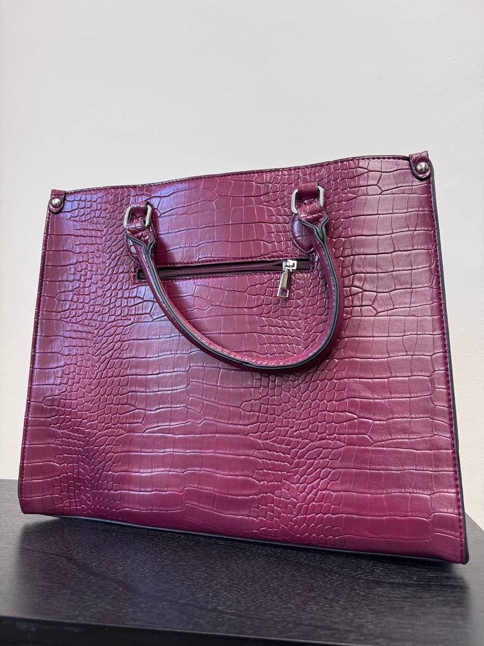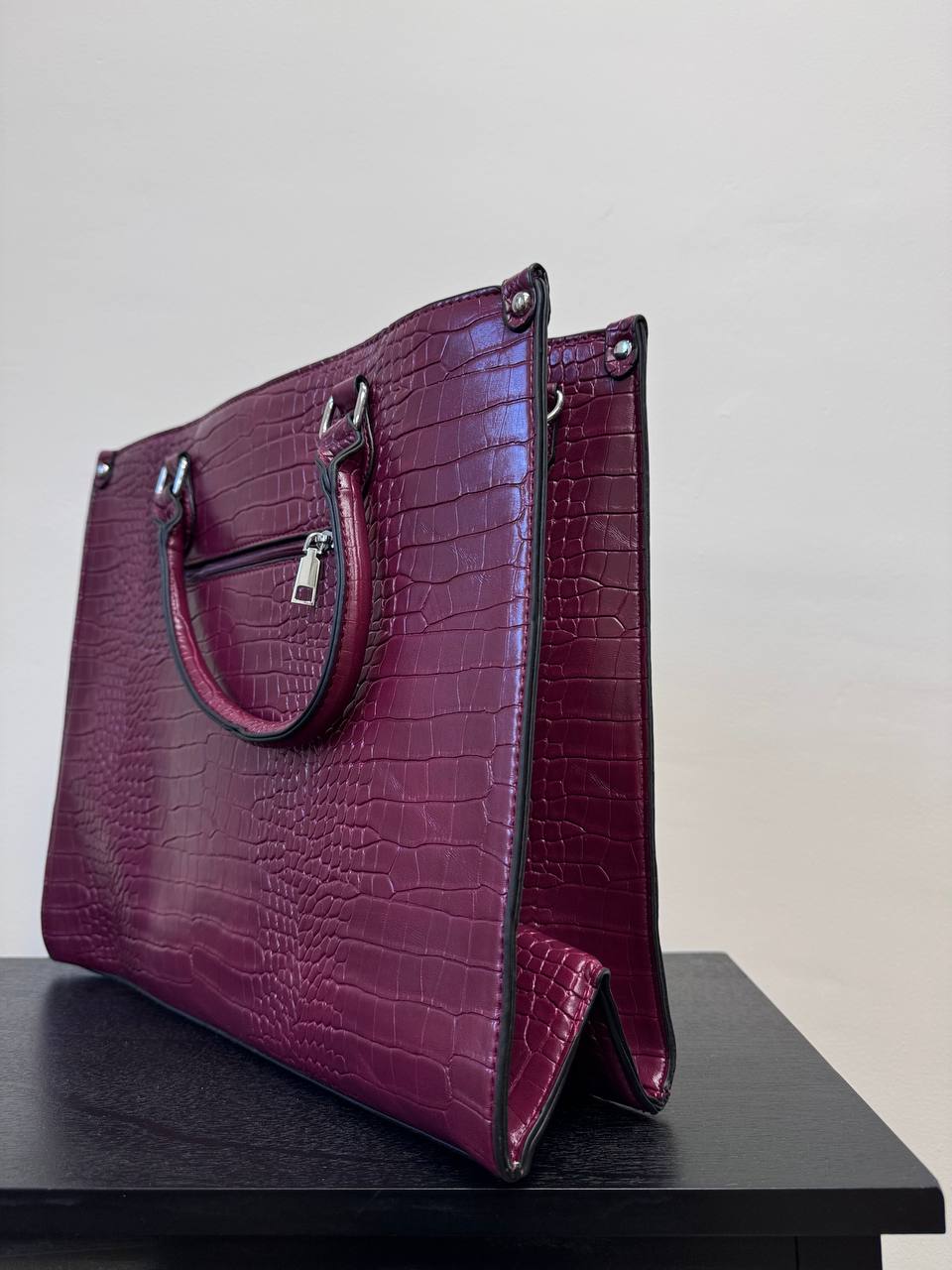 Borsa martellata a tinta unita sia a mano che a tracolla con dettaglio di tre taschine interne e una esterna.