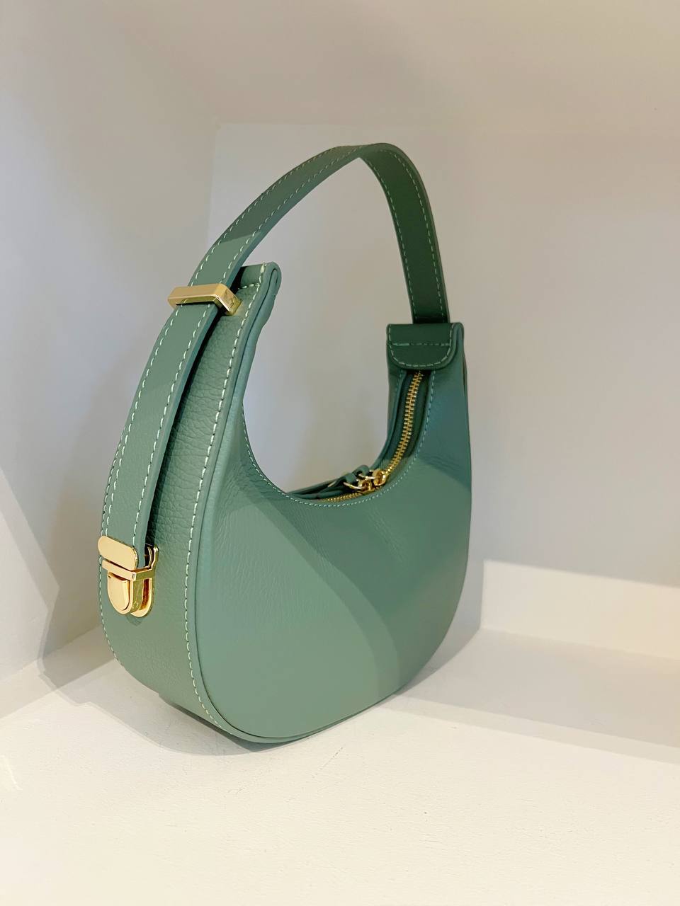 Borsa a mezza luna a tinta unita sia a mano che a tracolla.