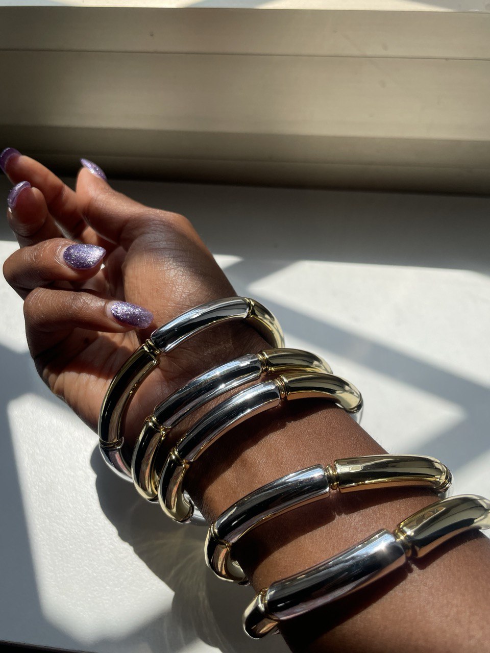 Bracciale elasticizzato con mini warm su tutta la lunghezza.